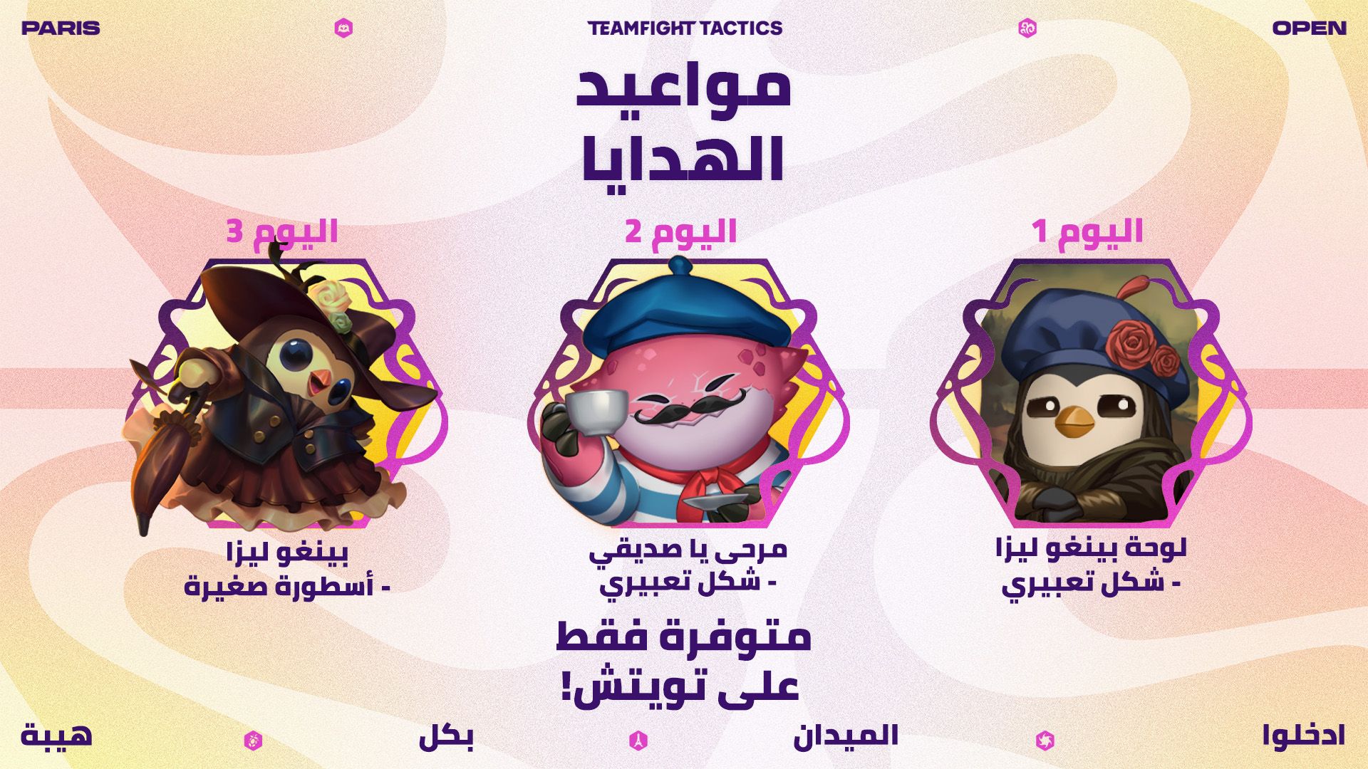 سيتم منح الهدايا مجددًا لجميع المشجعين الذين يشاهدون بث TFT Paris Open! سنمنح الهدايا في أيام المسابقة الثلاثة، لذا احرصوا على المشاهدة على تويتش أو يوتيوب لفرصةٍ في الكسب... احرصوا فقط على ربط اسم Riot الخاص بكم بحسابكم على تويتش أو يوتيوب.