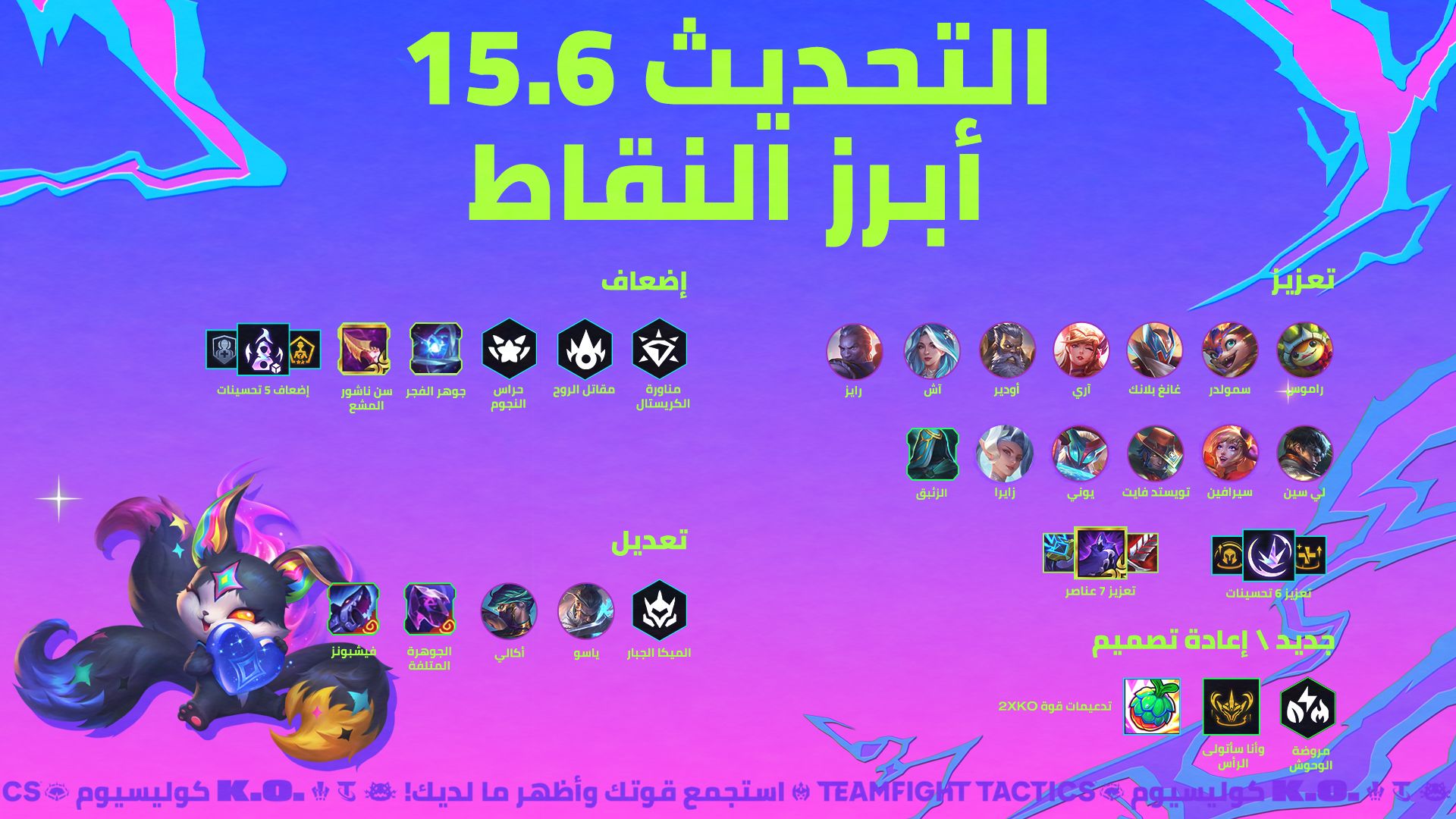 يجلب لكم التحديث 15.6 تعزيزات قوية لأبطال التكلفة 5، وإضعافاتٍ للخواص، وتعزيزاتٍ لبضعة أبطال كاري لا يؤدون دورهم كما يجب، وكل ذلك في جانب التوازن فحسب. ولدينا أيضًا تدعيمات قوةٍ جديدة بطابع 2XKO ستدخل إلى نقطة الملتقى للاحتفال... بدخول 2XKO مرحلة الإصدار المبكر! ولذلك ندعوكم للاستمتاع بالتغييرات الجديدة أو تجاوز مشارف ارتقاء أو شين، أيًا ما كان خياركم! كما نذكركم بإنهاء القمة باستخدام الـ 12 دليلًا بنهاية هذا التحديث للحصول على بوابتكم المجانية!