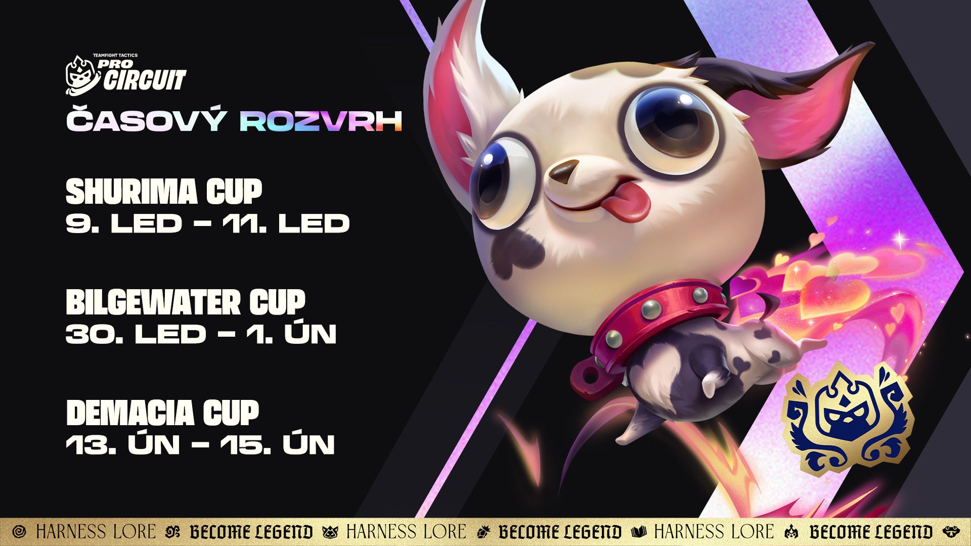 V rámci každé sady se účastníci TPC střetnou ve třech hlavních turnajích. Níže najdete harmonogram pro Mýty a legendy, ve kterých se naši nejlepší hráči utkají v jedněch z nejikoničtějších regionech Runeterry: