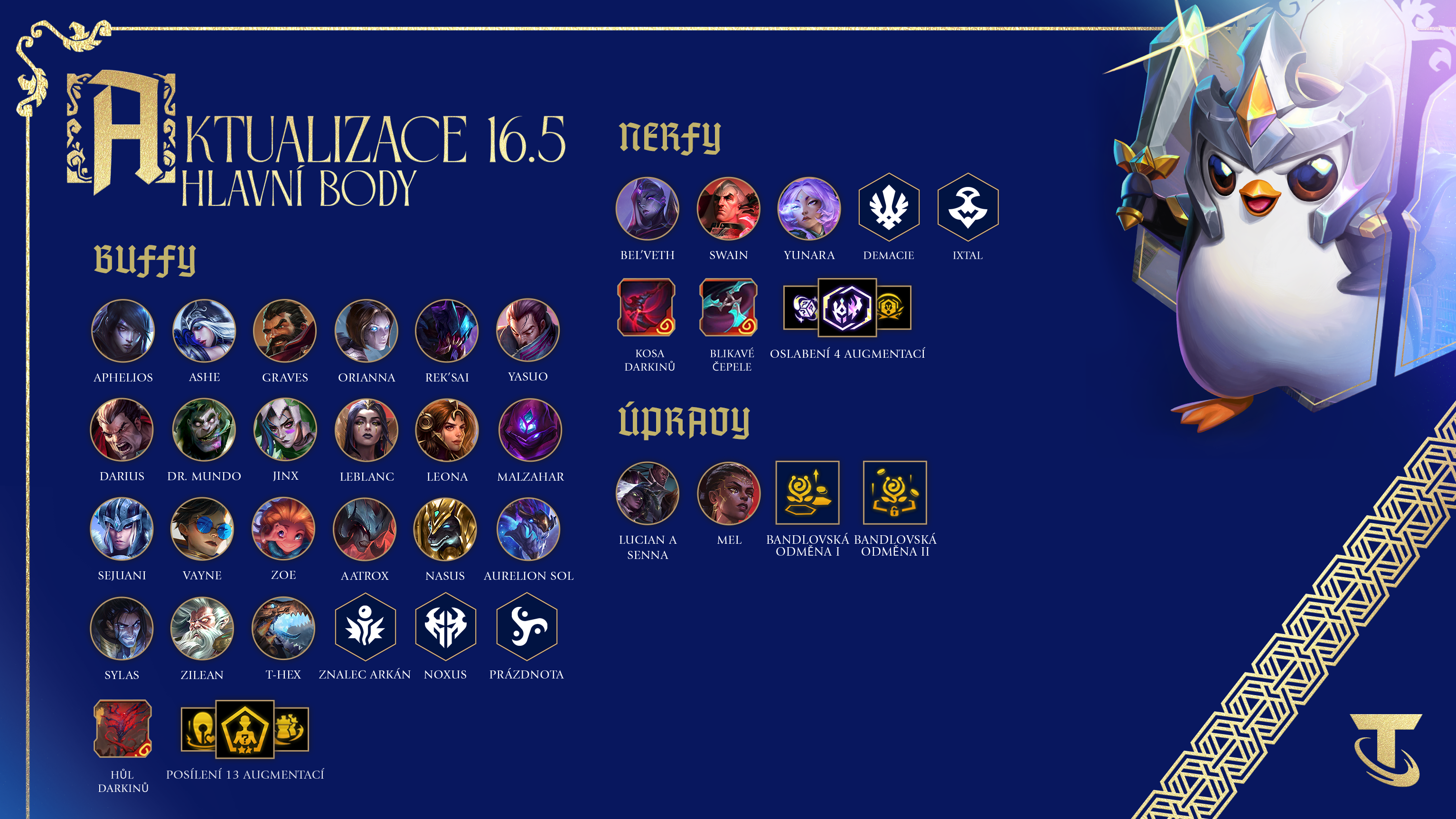 Aktualizace 16.5 vychází jen den po vydání těchto poznámek (pro většinu serverů ve čtvrtek v obvyklý čas). Verze 16.5 je plná buffů, které navazují na změny v úrovních a pravděpodobnostech získání z minulé aktualizace, jež usnadnily poskládání tříhvězdičkových jednotek za 3 zlaťáky – a tentokrát je ještě navíc posilujeme! A u jednotek za 3 zlaťáky to nekončí – čeká tu na vás taky spousta buffů pro jednotky za 2 zlaťáky, jelikož chceme, aby se strategie s výlovem obchodu dokázaly vyrovnat rychlému postupu na 8./9. úroveň.