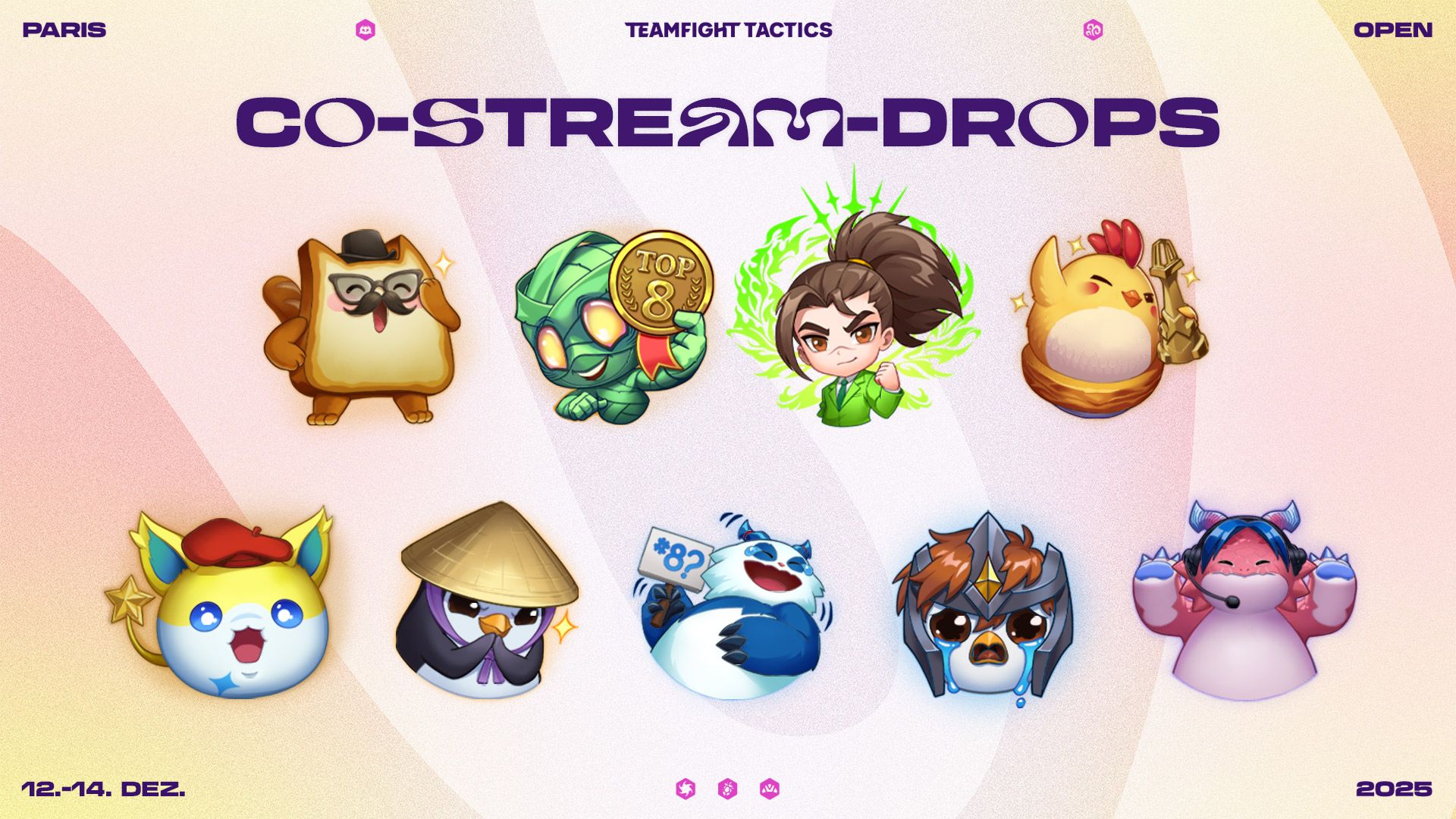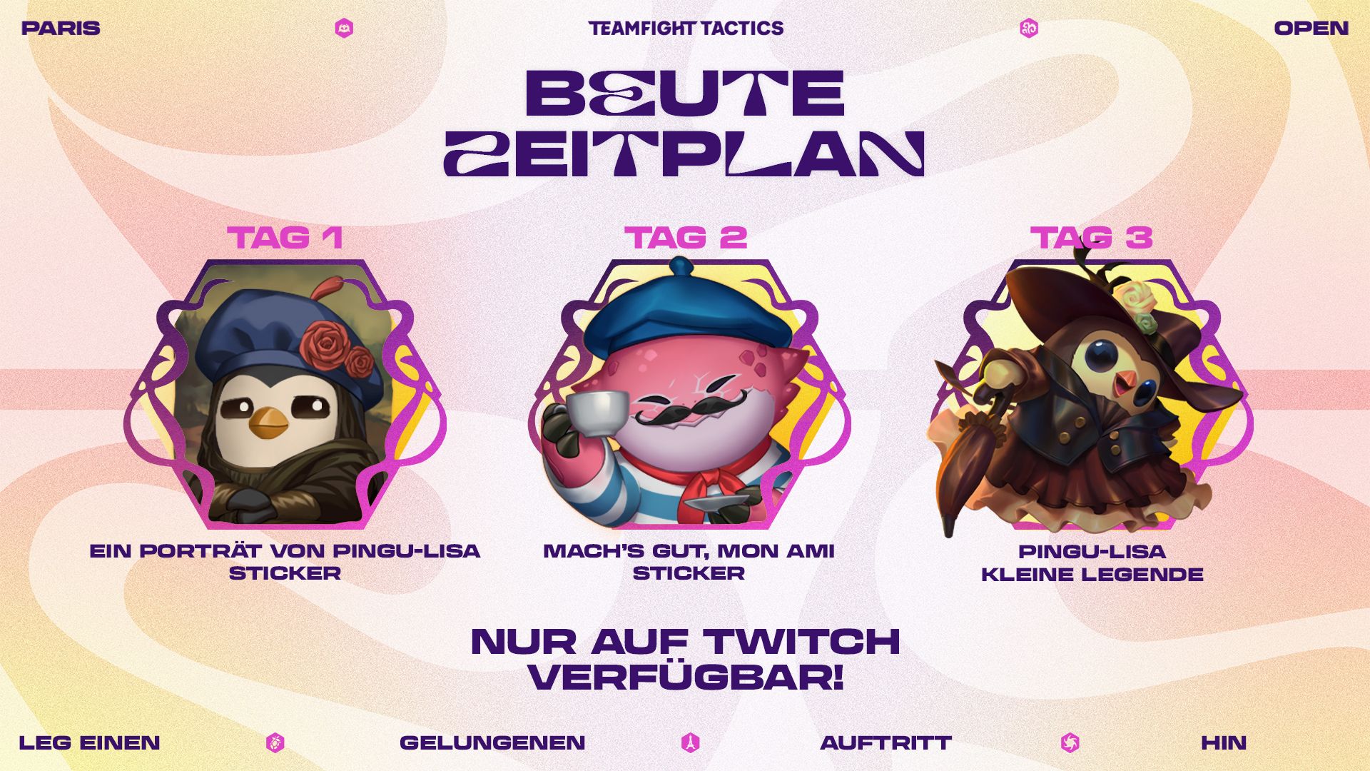 Auch während des TFT Paris Open gibt es wieder Beute für alle Fans, die zu den Streams einschalten! Wir bieten an allen drei Sendetagen Beute an. Schalte unbedingt ein auf Twitch oder YouTube für deine Chance, tolle Sachen zu gewinnen. Stelle nur sicher, dass deine Riot ID mit deinem Twitch- oder YouTube-Konto verknüpft ist.