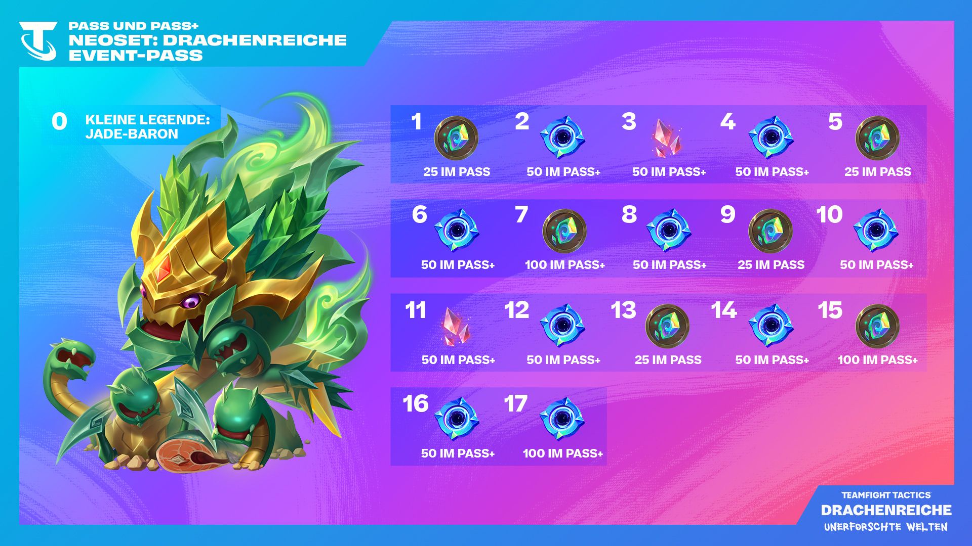 Der Neoset-Pass+ wird 500 Schatzmarken, 200 Weltenkristalle, 100 Sternensplitter und die exklusive kleine Legende Jade-Baron umfassen. Also hol dir deinen gleich heute für 975 RP!