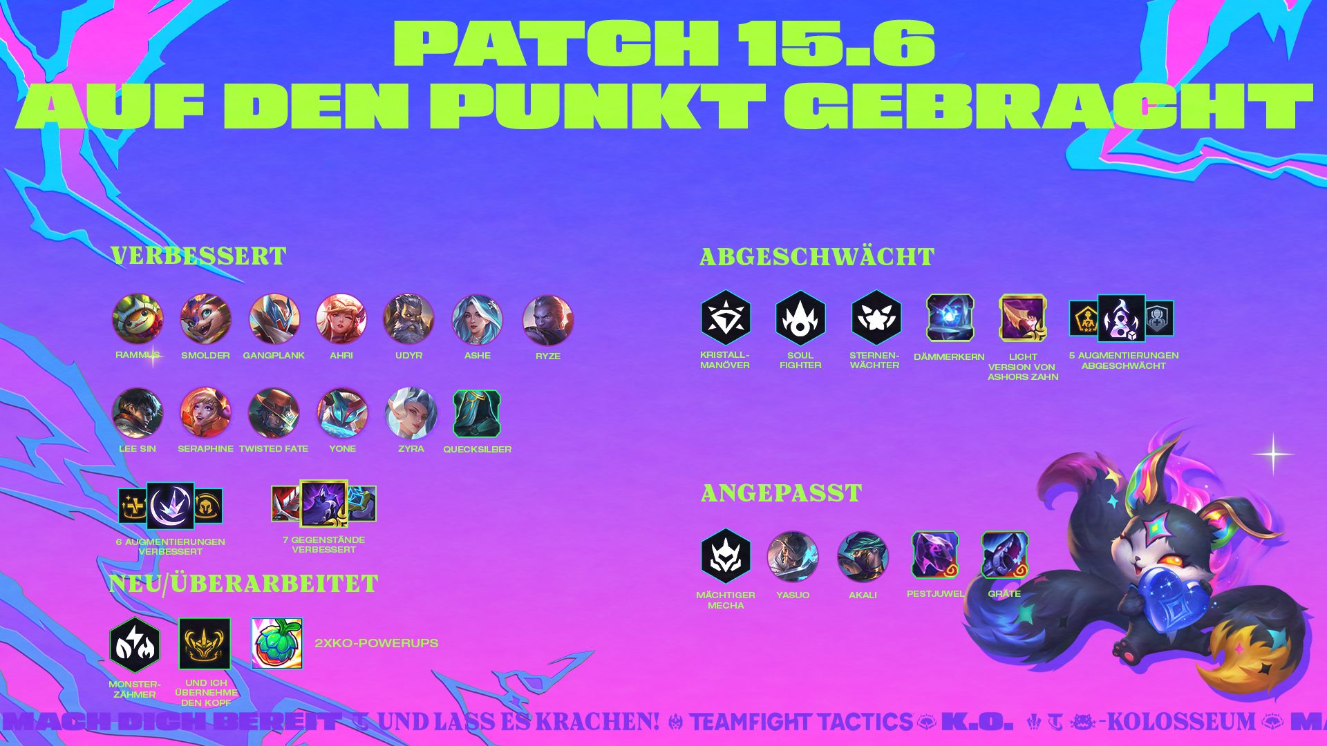 Patch 15.6 umfasst mächtige Buffs für 5-Gold-Champions, Abschwächungen für Attribute und Verbesserungen für einige Champions, die einfach ihre Carry-Fantasie nicht erfüllen, aber das liegt einfach an der Balance. Außerdem bereichern wir die Konvergenz mit neuen 2XKO-Powerups zu Ehren des Vorabzugangs von 2XKO! Dabei spiel es keine Rolle, ob du in Double Up aufs Ganze gehst oder dich durch die Schlüsselstelle von „Ao Shins Austieg“ kämpfst, du solltest sie dir auf jeden Fall schnappen! Und vergiss nicht, den Gipfel bis zum Ende dieses Patches mit 12 Bergführern abzuschließen, um dir ein kostenloses Portal zu sichern!
