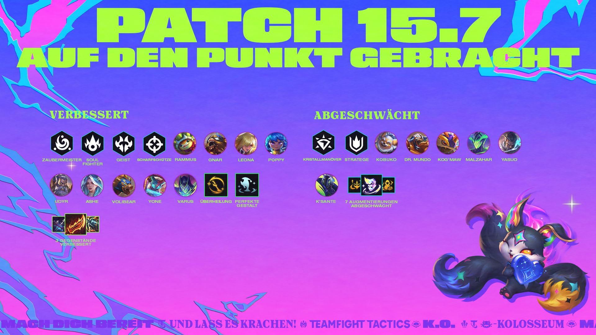 Patch 15.7 ist der vorvorletzte Patch von „K.O.-Kolosseum“ und der Patch, auf dem am Wochenende des 14. Novembers die Tactician's Crown gespielt wird. Gerüchten zufolge soll bei dieser Gelegenheit auch etwas angekündigt werden – aber das hast du von Katie, nicht Rodger, OKAY?! Wie dem auch sei, nur wenige Stunden nach der Veröffentlichung dieses Patches geht auch Neoset: Unerforschte Welten an den Start.