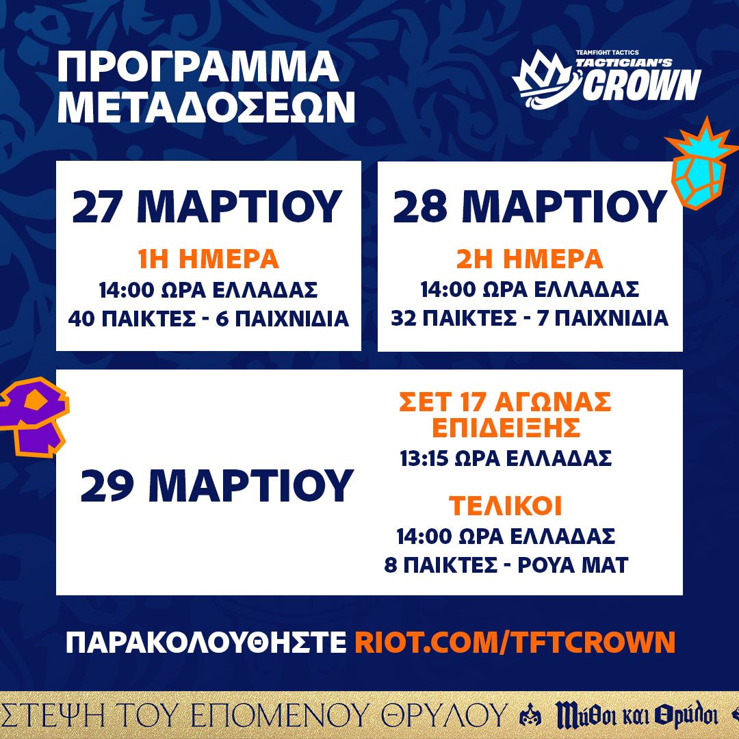 Ζήστε την ιστορία του Μύθοι και Θρύλοι στο Tactician’s Crown, από 27-29 Μαρτίου, όπου οι κορυφαίοι 40 παίκτες παγκοσμίως συγκρούονται για μια θέση στην ιστορία της Γης των Ρούνων. Μέσα σε ένα επικό σαββατοκύριακο, θα αποδείξουν ποιος αξίζει να στεφτεί ο καλύτερος παίκτης TFT στον κόσμο.