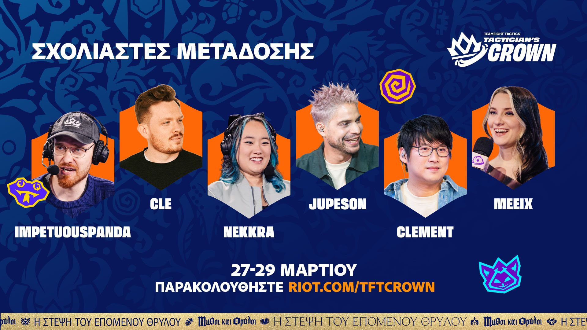Κάθε έπος χρειάζεται κάποιον να το αφηγηθεί. Γνωρίστε τους παρουσιαστές για το Tactician's Crown του Μύθοι και Θρύλοι και ζήστε μαζί τους τη δράση, τα σημαντικότερα σημεία και τις πιο θρυλικές στιγμές καθώς οι κορυφαίοι 40 Σύμβουλοι γράφουν ιστορία στη Γη των Ρούνων!