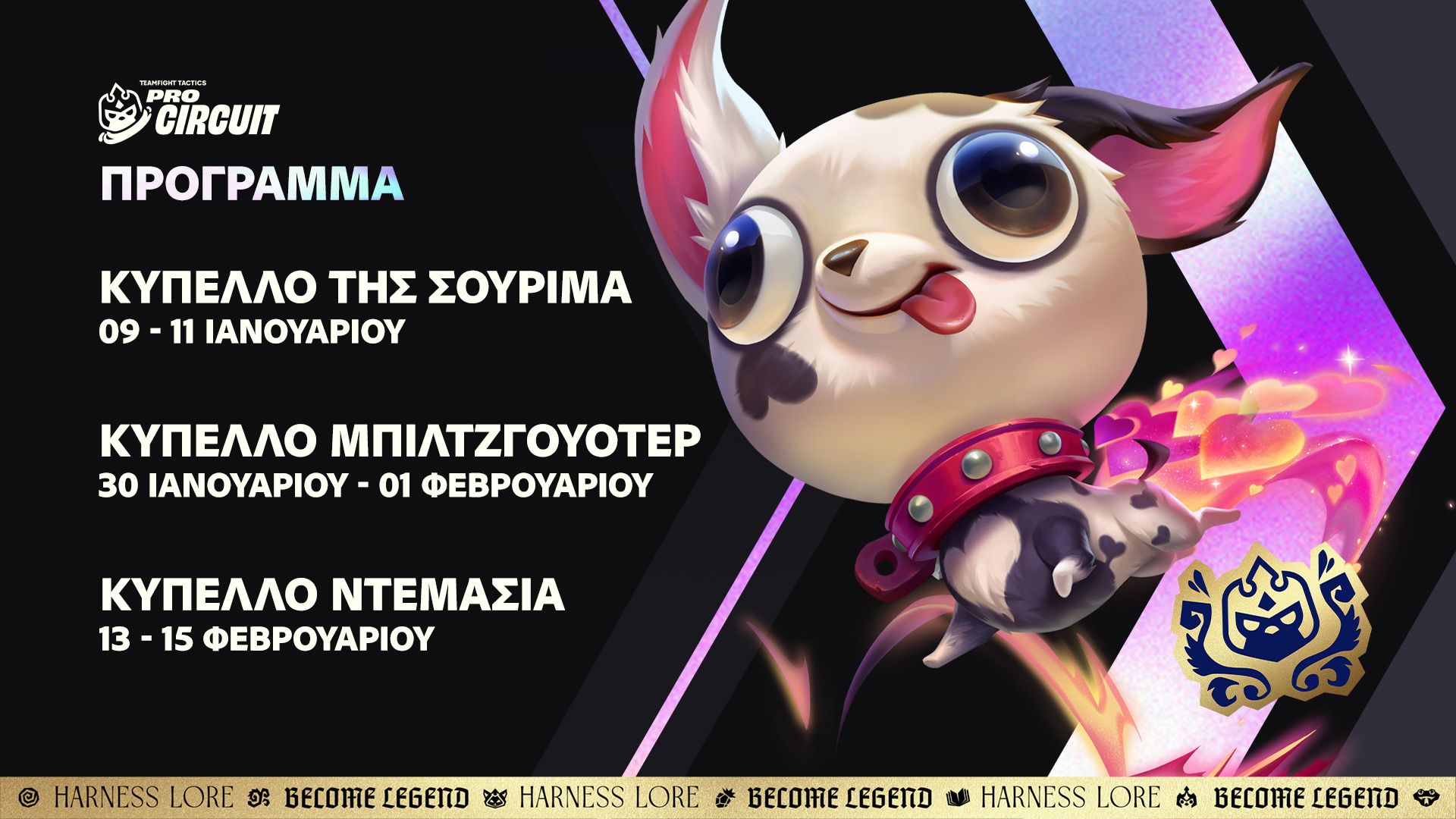 Σε κάθε Σετ, οι παίκτες του TPC αγωνίζονται σε τρεις μεγάλες εκδηλώσεις. Παρακάτω μπορείτε να βρείτε το πρόγραμμα για το Μύθοι και Θρύλοι, όπου οι κορυφαίοι διεκδικητές θα αναμετρηθούν σε κάποιες από τις πιο εμβληματικές περιοχές της Γης των Ρούνων: