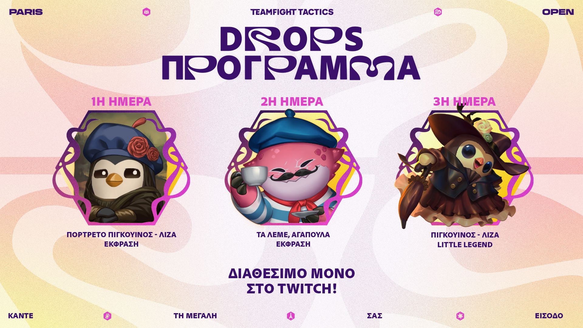 Για μια ακόμη φορά, θα μοιραστούν drops σε όλους τους φίλους που θα συντονιστούν μαζί μας στο TFT Paris Open! Θα προσφέρουμε drops και στις τρεις ημέρες της διοργάνωσης, οπότε φροντίστε οπωσδήποτε να συντονιστείτε μέσω Twitch ή YouTube για να έχετε την ευκαιρία να κερδίσετε, μόνο βεβαιωθείτε ότι έχετε συνδέσει το Riot ID σας με τον λογαριασμό σας Twitch ή YouTube.