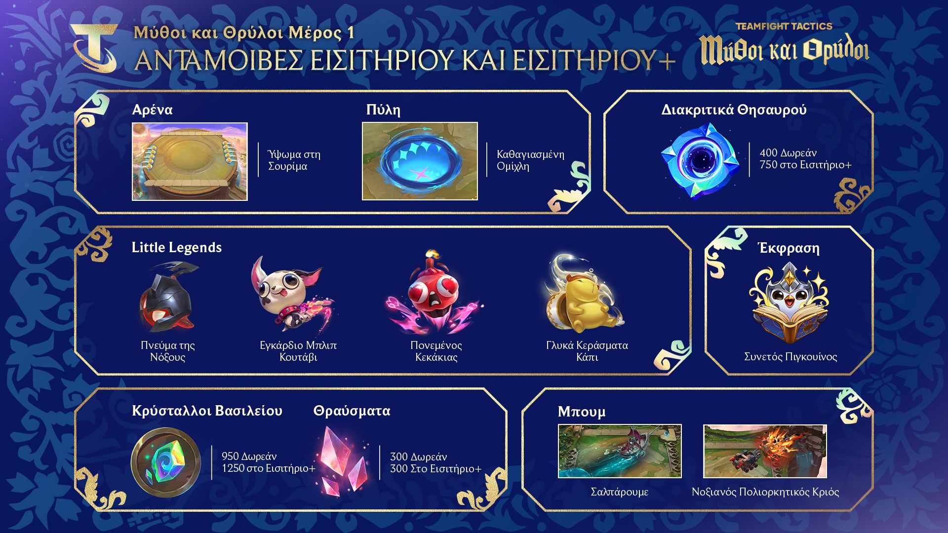 Αν θέλετε ακόμα περισσότερα από το Εισιτήριο, μπορείτε να το αναβαθμίσετε σε Εισιτήριο+ με 1295 RP. Μπορείτε πάντα να περιμένετε να δείτε μέχρι πού θα καταφέρετε να φτάσετε με τη δωρεάν έκδοση του Εισιτηρίου, πριν κάνετε την αναβάθμιση για να αποκτήσετε όλες τις ανταμοιβές που ξεκλειδώσατε νωρίτερα. Ας δούμε λίγο τις υπέροχες ανταμοιβές που σας περιμένουν!
