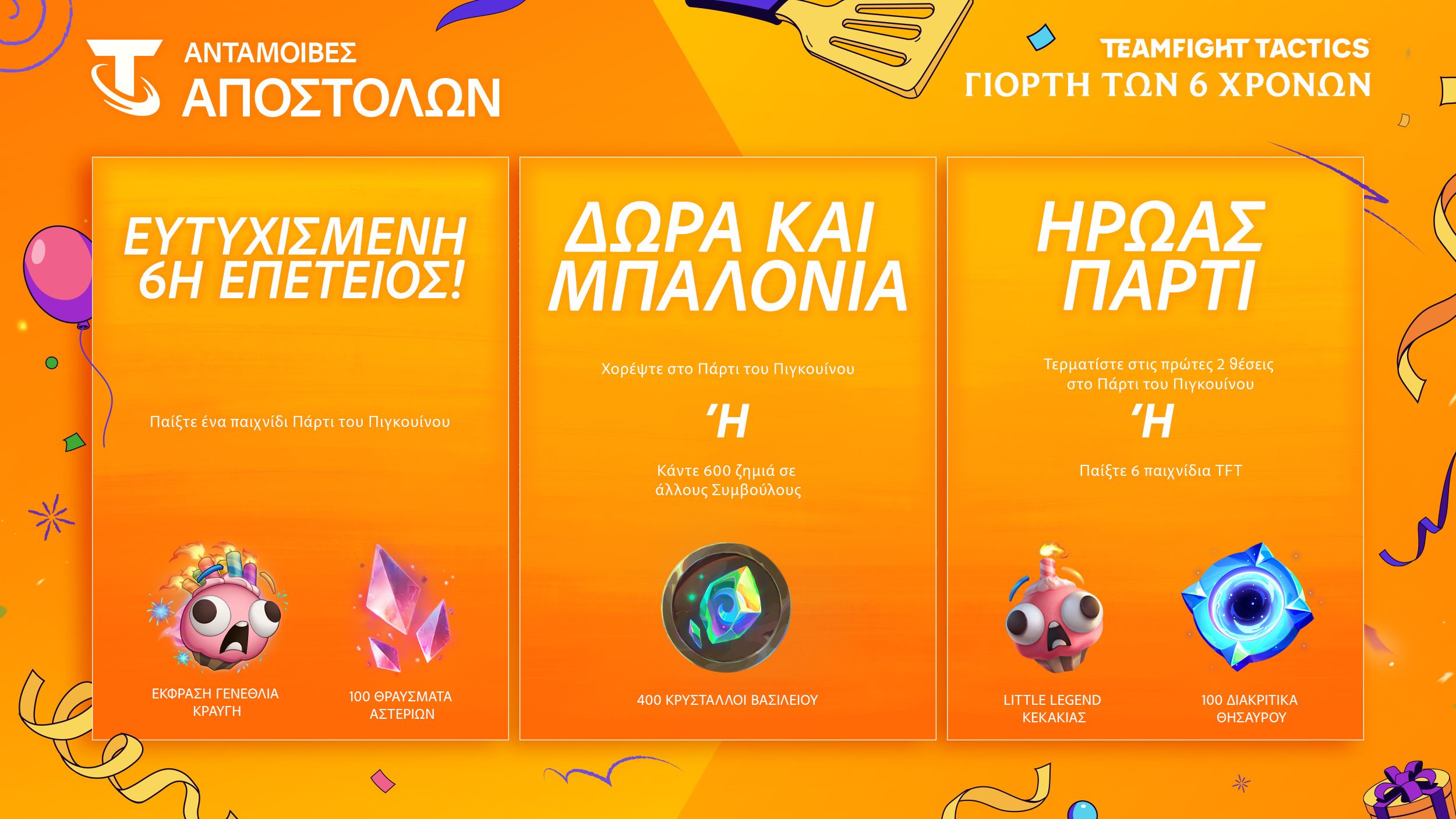 Κλείνεις για λίγο τα μάτια σου και όταν τα ξανανοίγεις έχει ολοκληρωθεί άλλη μία περιφορά γύρω από τον ήλιο. Τα 6α γενέθλια του TFT βρίσκονται προ των πυλών και θέλουμε να σας προετοιμάσουμε για αυτό που έρχεται. Ο Πιγκουίνος επιστρέφει από τις 11 Ιουνίου έως τις 15 Ιουλίου, με τη θρυλική του λειτουργία παιχνιδιού, το Πάρτι του Πιγκουίνου και όλα τα προηγούμενα σετ συμμετέχουν στους εορτασμούς, με τα πιο εμβληματικά Χαρακτηριστικά του TFT!