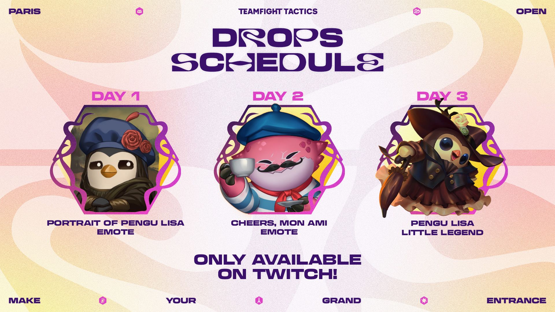 Drops will once again be given out to all fans that tune into the TFT Paris Open! We’ll offer up drops on all three days of competition, so be sure to tune in via Twitch or YouTube for your chance to win–just be sure to have your Riot ID linked to your Twitch or YouTube account.