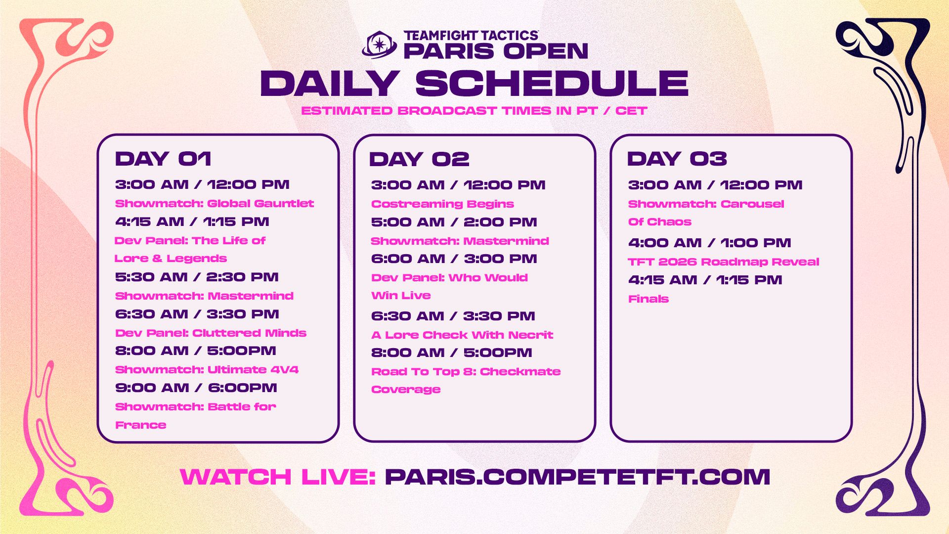 Make sure to tune in on December 12-14 to catch the TFT Paris Open! Further details on the broadcast schedule can be found below.