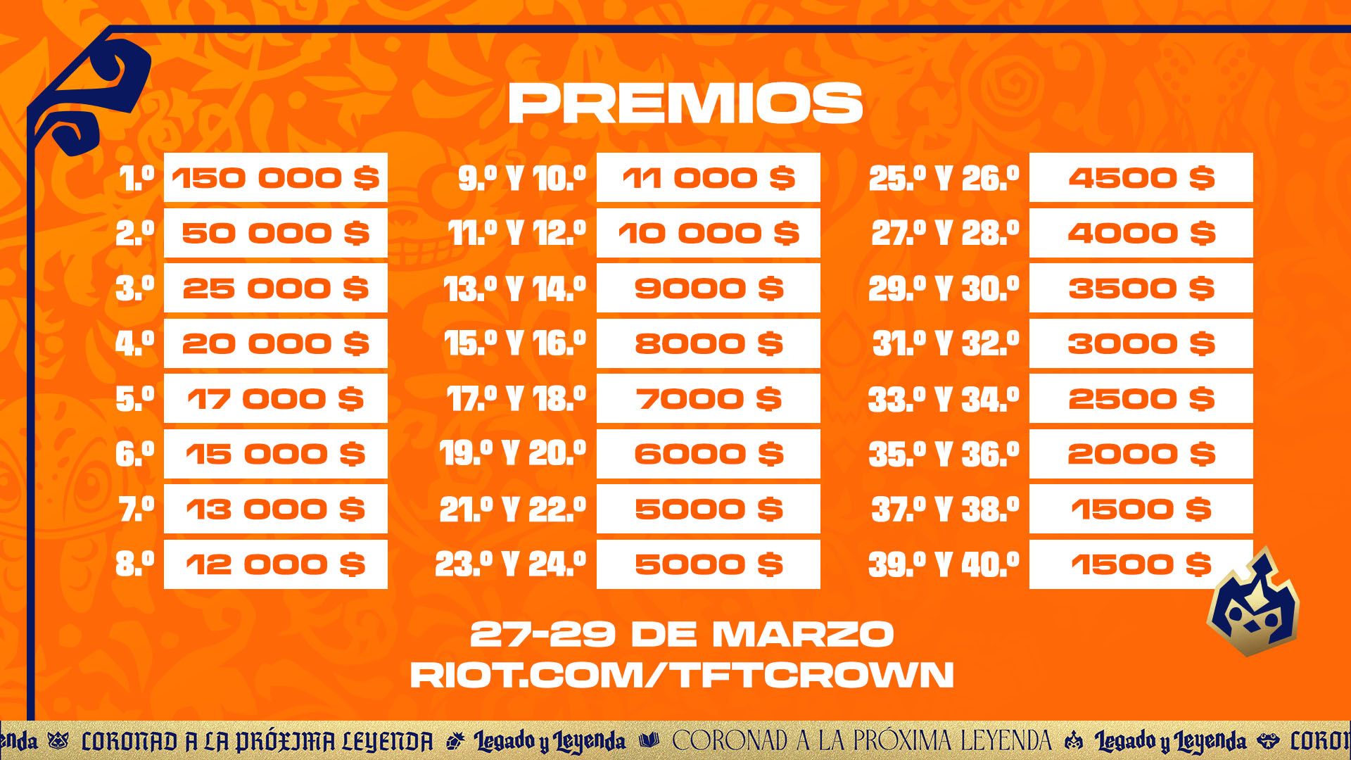 Los participantes competirán por hacerse con parte del premio, que suma un total de 470 000 dólares. La leyenda que consiga hacerse con el primer puesto se llevará a casa 150 000 dólares, la Tactician's Crown y el prestigioso título de campeón mundial de Legado y leyenda.Consultad el desglose del premio para descubrir cómo se distribuirá.