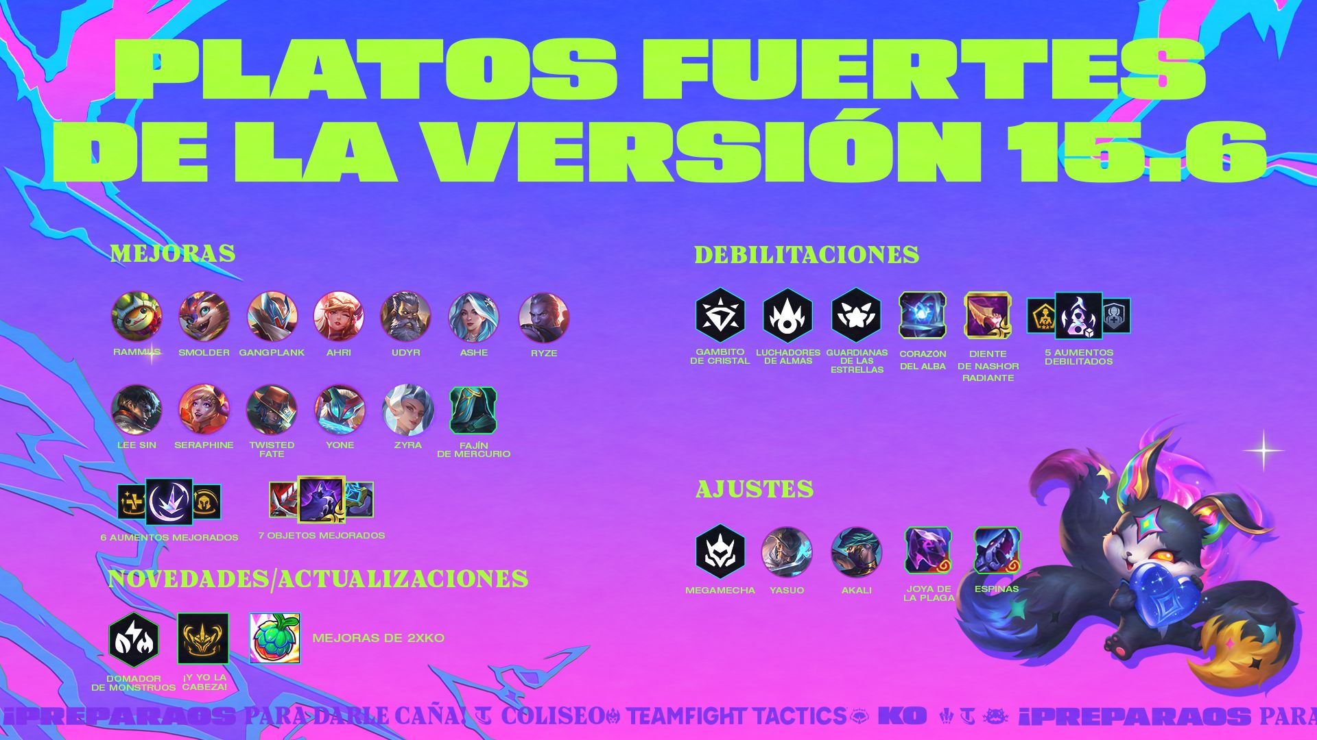 En la versión 15.6, traemos poderosas mejoras para las unidades de coste 5, debilitaciones a atributos y mejoras a los carries que se están quedando atrás, ¡y eso es todo en cuanto al equilibrio del juego! También tenemos nuevas mejoras que llegan a la Convergencia para celebrar el acceso anticipado de 2XKO. Tanto si queréis ser un Dúo dinámico en Double Up o llegar hasta el Crux de El ascenso de Ao Shin, ¡haceos con estas nuevas mejoras! Aprovechamos para recordaros que debéis llegar a la cima con 12 guías al final de la versión para conseguir el portal gratis.