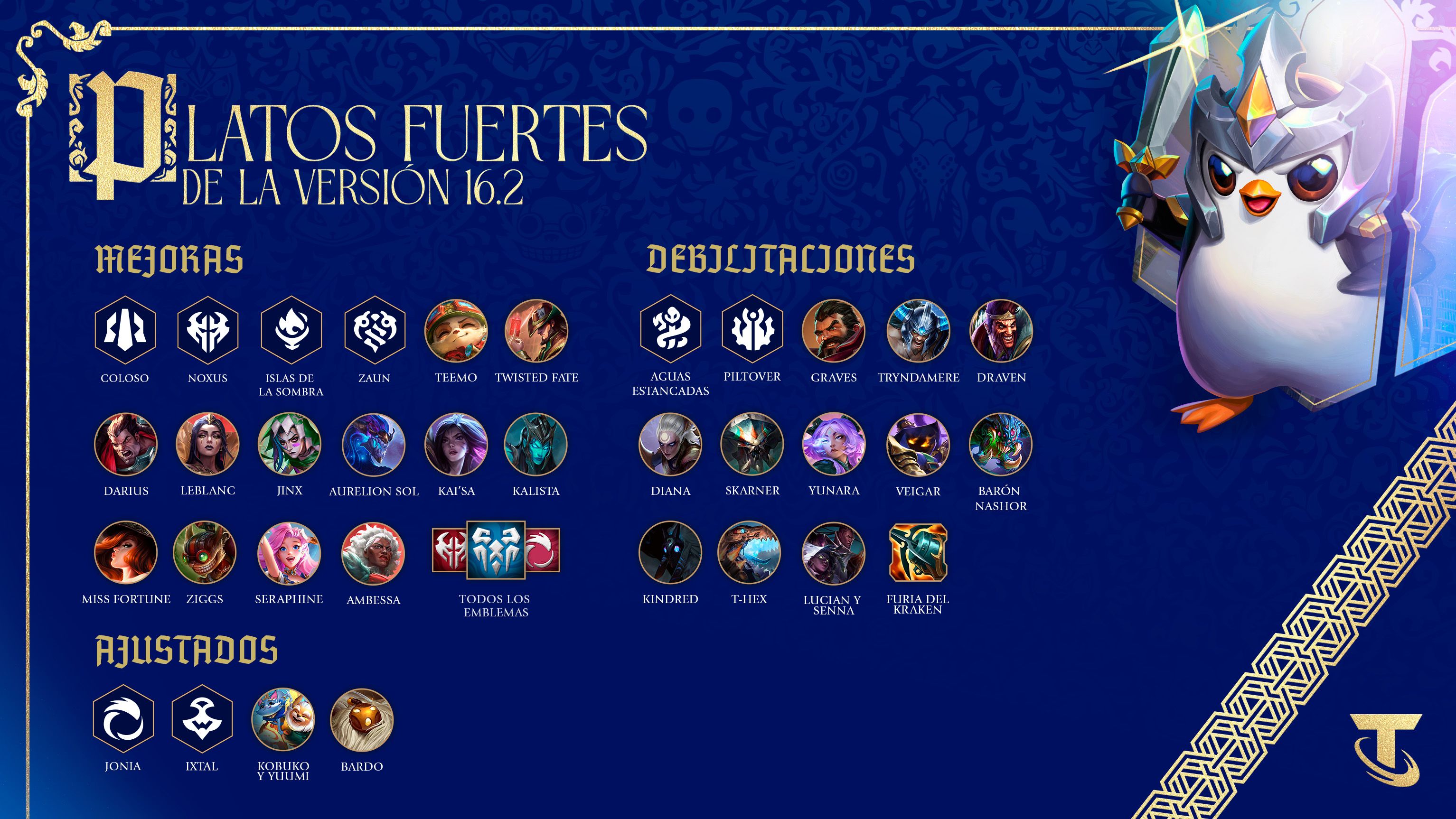 Por último, sabemos que estáis deseando enteraros de los ajustes a la condición de desbloqueo, la búsqueda de objetivos y demás. La fecha de esta versión 16.2 era más ajustada y solo hemos podido reaccionar con ajustes de cifras. Ya hemos preparado varios cambios importantes para solucionar problemas de diseño. Los implementaremos con la versión 16.3. Por ahora, os deseamos un feliz año nuevo, y recordad cumplir con vuestros propósitos, sed constantes y entrenad con Sett para haceros más grandes (o atacar más rápido).