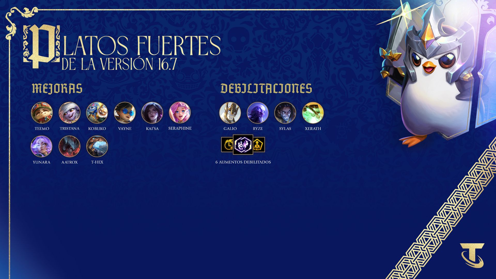 La versión 16.7 es algo más pequeña y da continuación a los grandes cambios que recibieron las condiciones de desbloqueo de la versión 16.6. En general, estamos contentos con el estado del equilibrio en la versión 16.6, así que, como 16.7 será la versión de la Tactician's Crown, vamos a implementar cambios más pequeños, seguros y concretos.