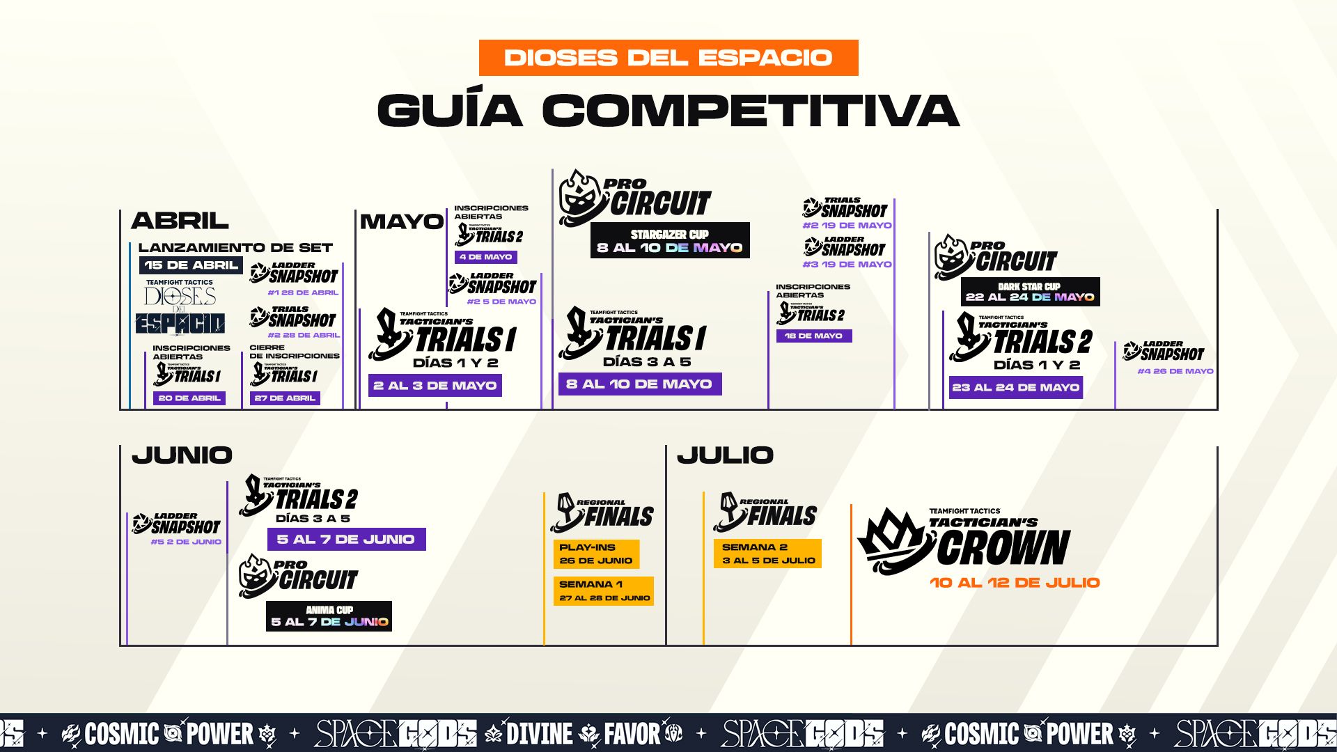 El TFT Pro Circuit es el ecosistema competitivo de primer nivel del juego donde los 32 mejores jugadores de cada región luchan por conseguir Puntos Pro, un premio grande y un lugar en la final regional. Las fechas para las tres copas del TPC de Dioses del Espacio serán las siguientes: