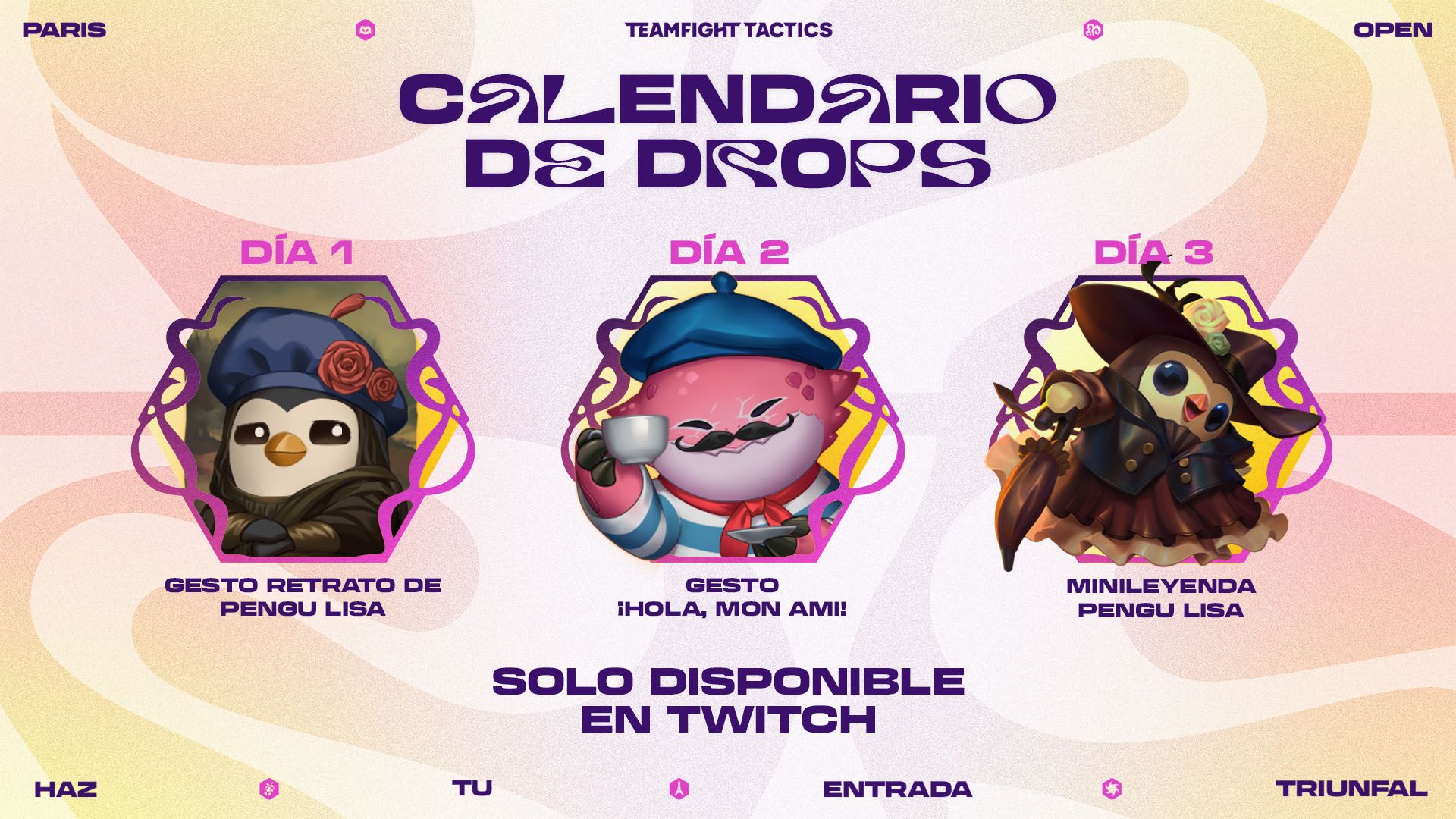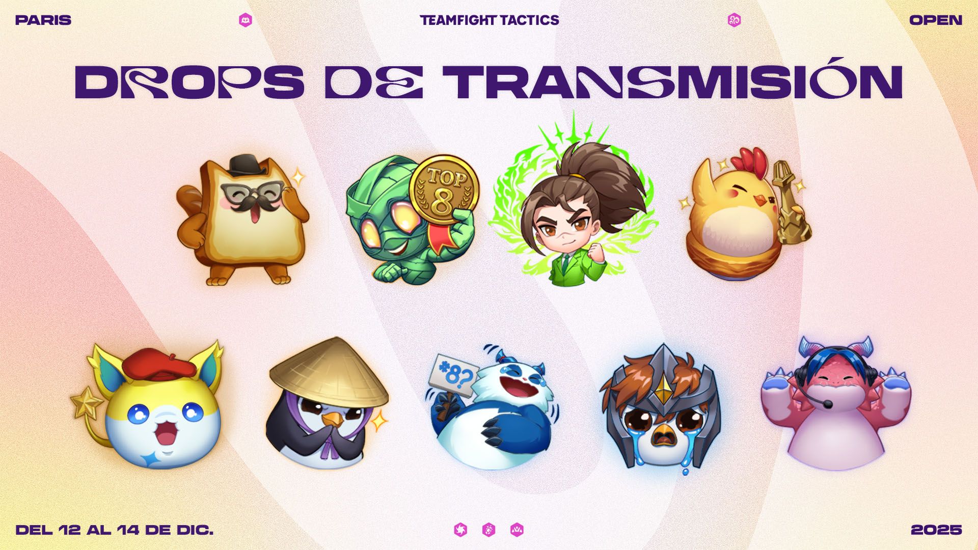 ¡Otra vez otorgaremos drops a todos los fans que sintonicen el TFT Paris Open! Ofreceremos drops durante los tres días de la competencia, así que sígannos en Twitch o en YouTube para tener la oportunidad de ganar uno; solo asegúrense de vincular su Riot ID con su cuenta de Twitch o de YouTube.