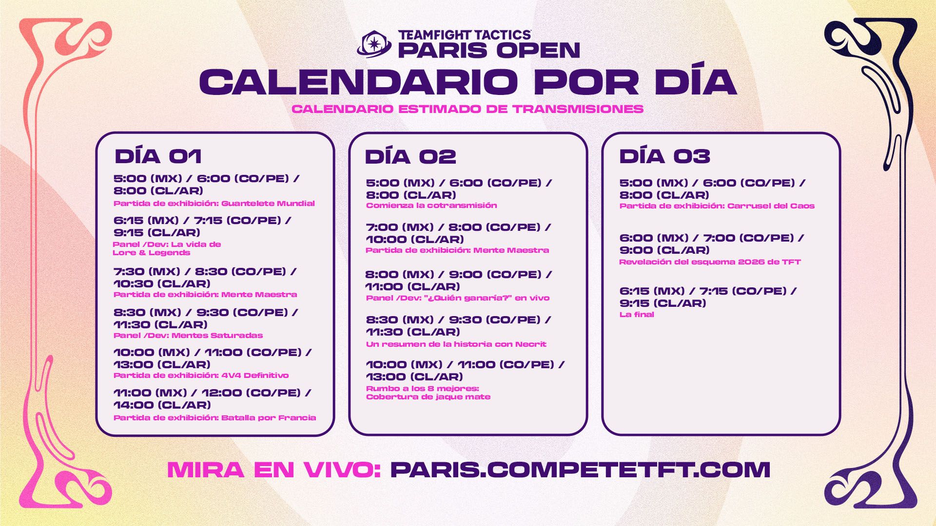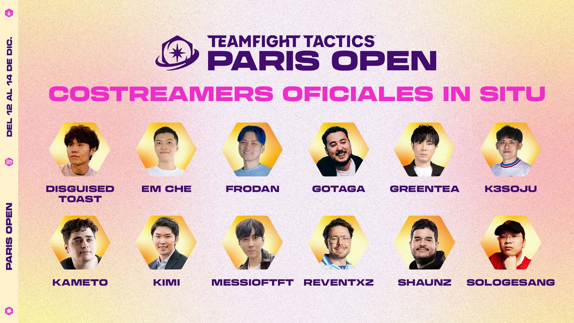 ¡Sintonícennos entre el 12 al 14 de diciembre para ver el TFT Paris Open! Abajo verán más detalles sobre el calendario de la transmisión.