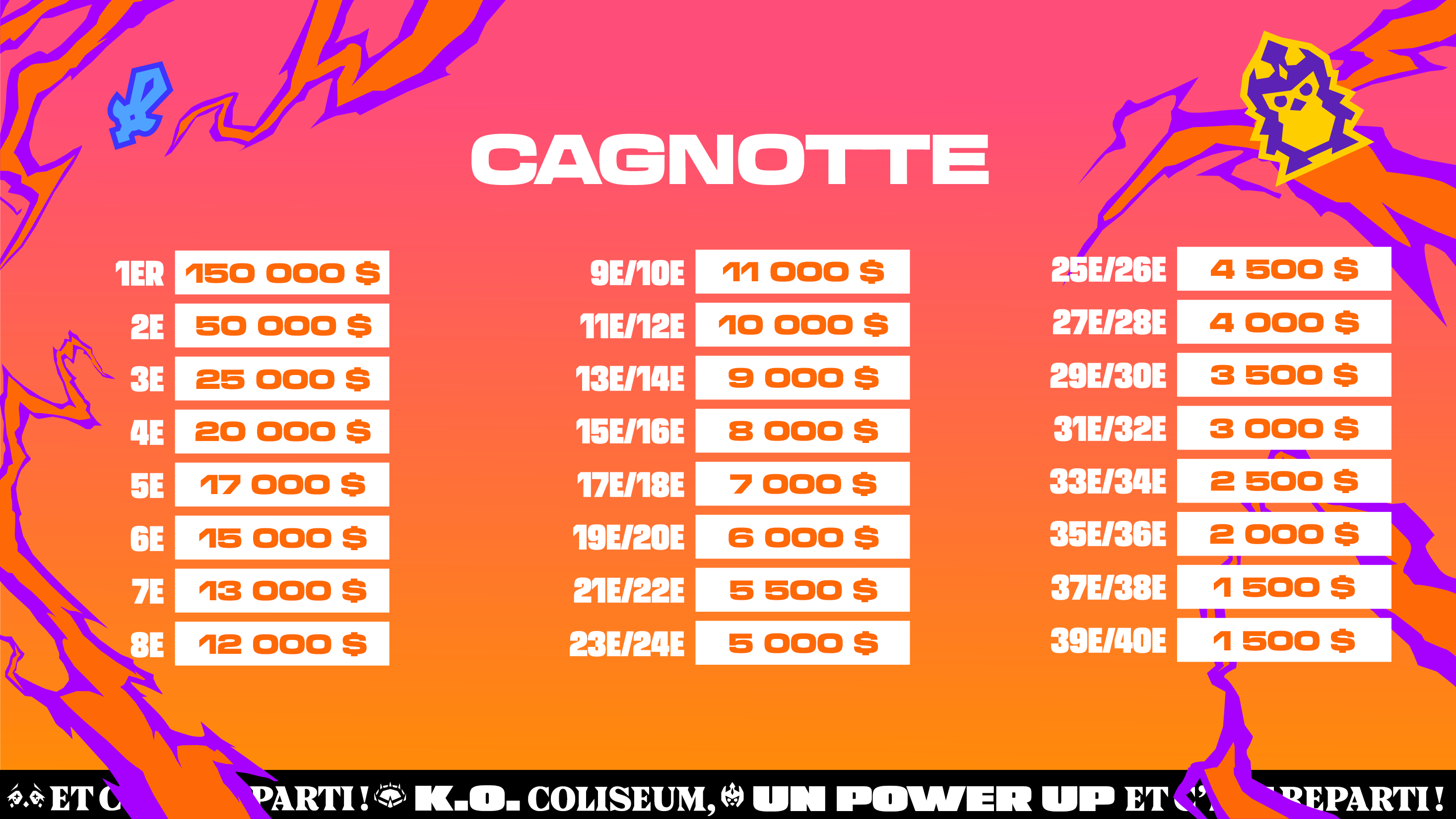 Les joueurs seront en compétition pour obtenir une part de la cagnotte totale de 470 000 $ (environ 450 750 €). Voici les détails de la répartition de cette cagnotte :