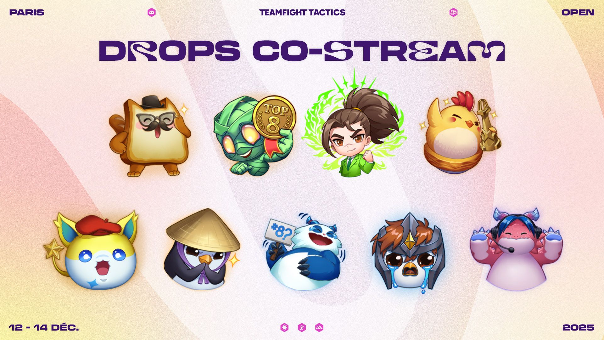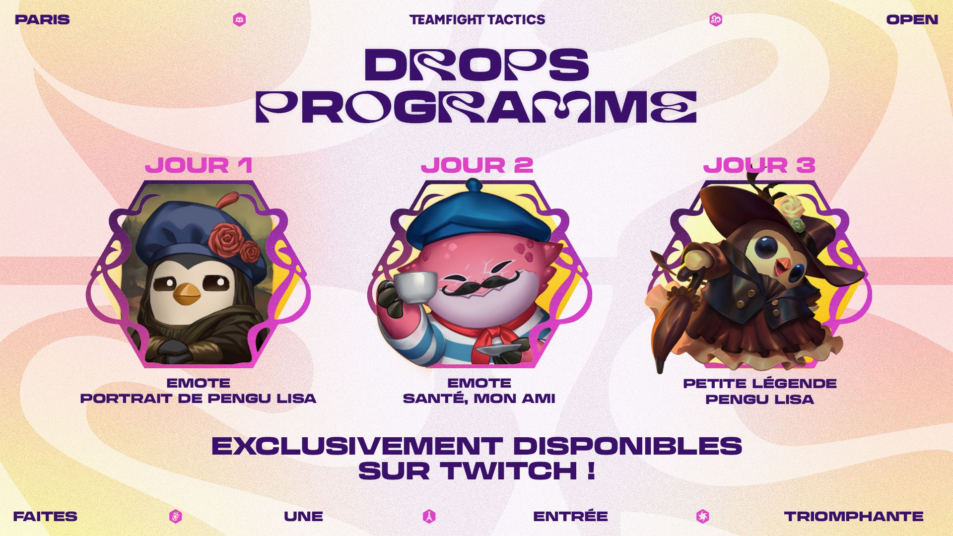 Des drops seront distribués à tous les fans qui suivront le TFT Paris Open ! Nous offrirons des drops pendant les trois jours de compétition, alors n'oubliez pas de vous connecter via Twitch ou YouTube pour tenter votre chance. Assurez-vous simplement que votre Riot ID soit bien lié à votre compte Twitch ou YouTube.