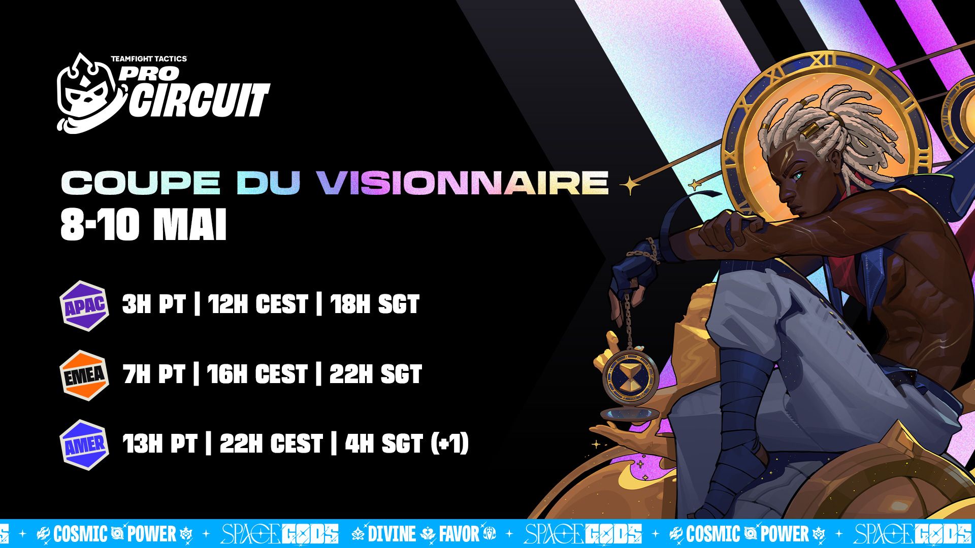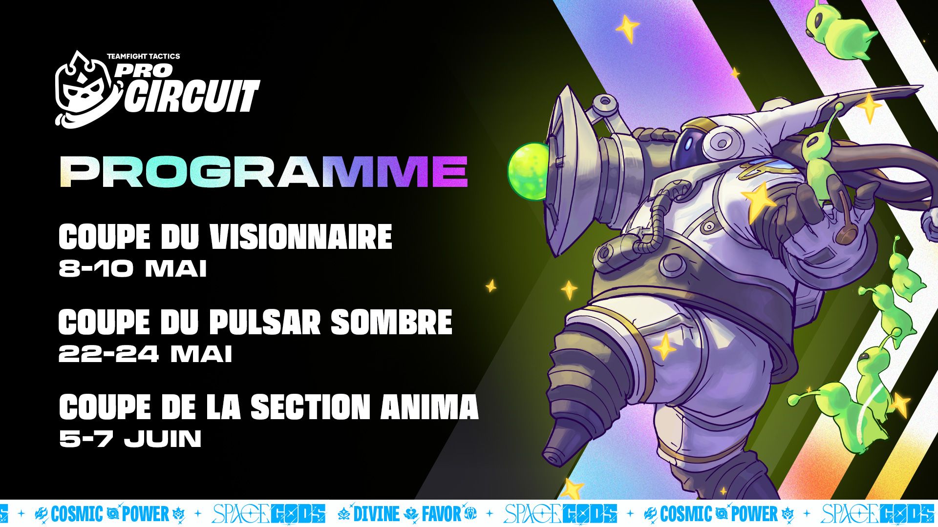 Le TFT Pro Circuit est l'écosystème compétitif des joueurs de palier 1 dans lequel les 32 meilleurs joueurs de chaque région s'affrontent pour remporter des points Pro, une cagnotte de 30 000 USD (environ 25 500 EUR) et pour se qualifier pour les finales régionales. Voici les dates des 3 coupes TPC du set Space Gods :