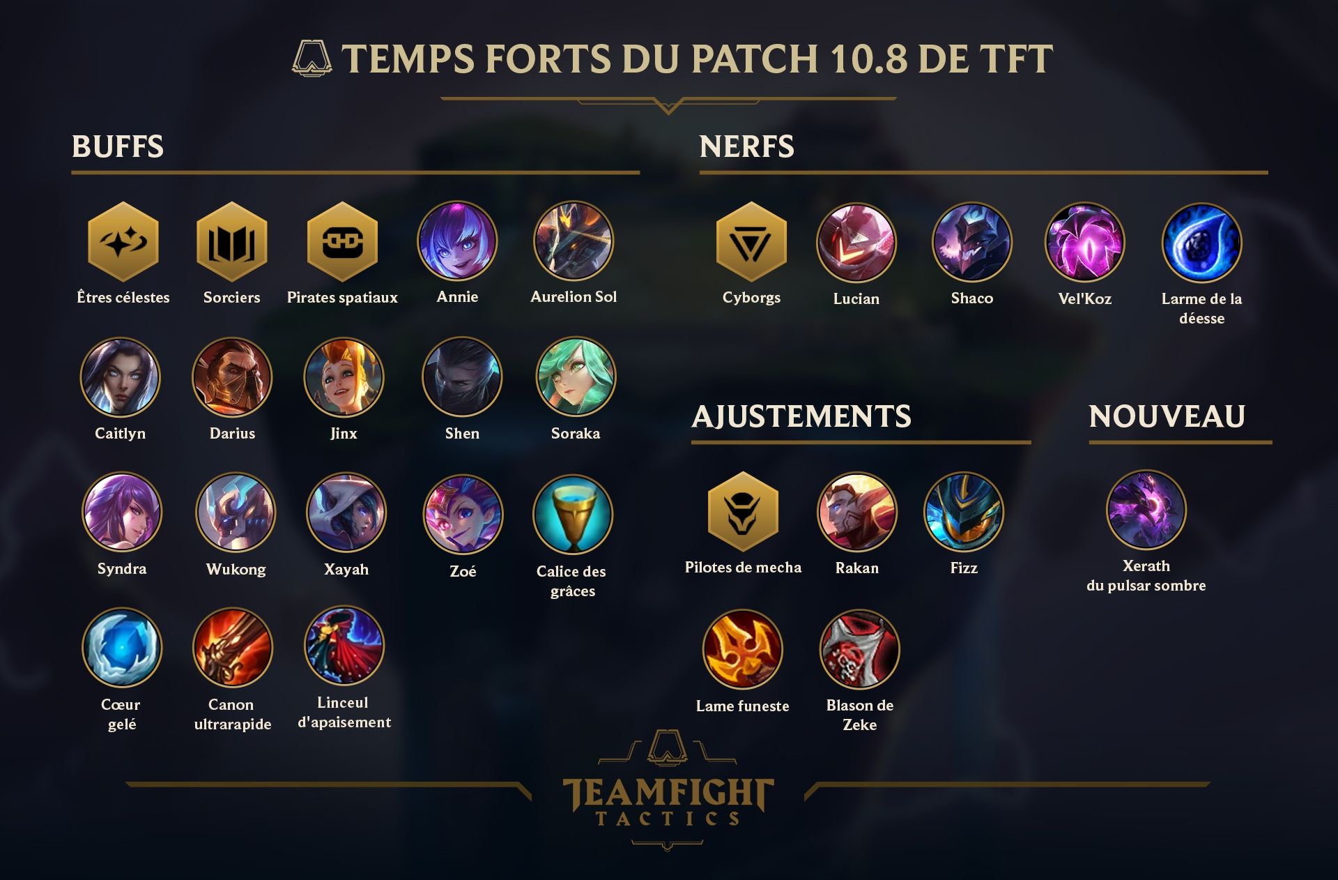 Voici venu le temps du patch 10.8 ! Nous avons plusieurs choses à vous annoncer, alors allons-y. Tout d'abord, un nouveau champion légendaire, Xerath, pourra désormais compléter vos compos Pulsars sombres et Sorciers. Ce carry de fin de partie fait tomber des météorites sur le champ de bataille, et ces gros cailloux de l'espace font encore plus de ravages lorsqu'ils tuent des ennemis. Nous ajoutons également deux nouvelles galaxies : Secteur commercial et Galaxie super dense. Une fois par manche, le Secteur commercial vous permet de relancer gratuitement la boutique. La Galaxie super dense, quant à elle, vous offre une Force de la nature lorsque vous atteignez le niveau 5.
