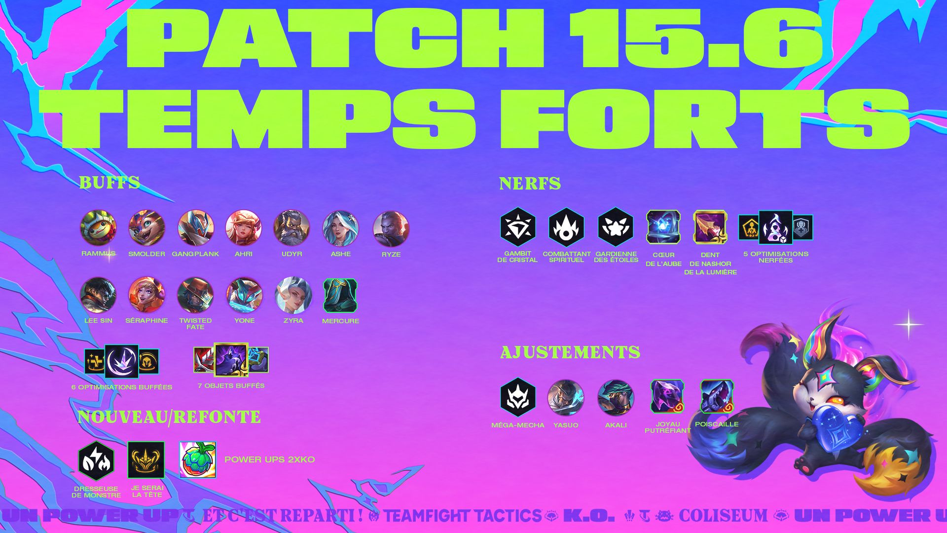 Le patch 15.6 apporte de puissants buffs aux unités à 5 PO, des nerfs de type et d'autres buffs de plusieurs carrys qui refusent de carry. L'équilibrage habituel, quoi. De nouveaux power ups sur le thème de 2XKO entrent également dans la Convergence pour fêter la sortie du jeu ! Que vous coopériez en Double Up ou tentiez l'ascension du passage-clé de l'Ascension d'Ao Shin, n'hésitez pas à vous en servir ! N'oubliez pas de terminer votre ascension avec les 12 guides d'ici la fin de ce patch pour récupérer votre portail gratuit !