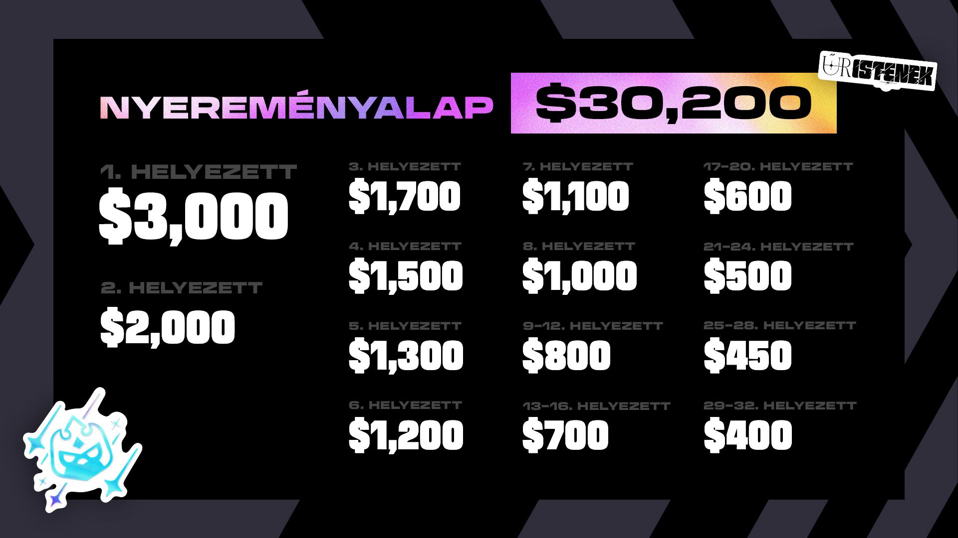 A játékosok a 30 000 USD-s teljes nyereményalap őket megillető részéért küzdenek. Részletek lent: