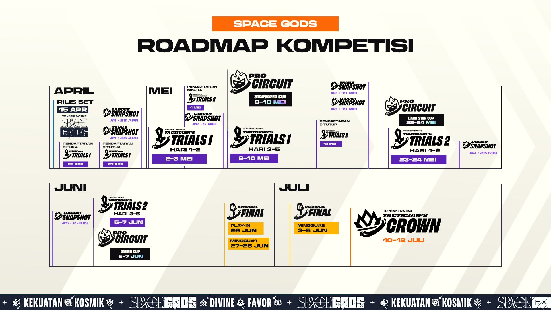 Dengan set baru ini, Teamfight Tactics terus menyempurnakan ekosistem kompetitifnya melalui berbagai pembaruan yang membuat struktur global jadi lebih rapi. Kamu bisa mengharapkan jalur kualifikasi yang lebih mulus, progresi yang lebih jelas, dan perjalanan yang lebih terhubung dari level regional hingga panggung dunia. Semua ini sudah tertulis dalam bintang-bintang Space Gods.