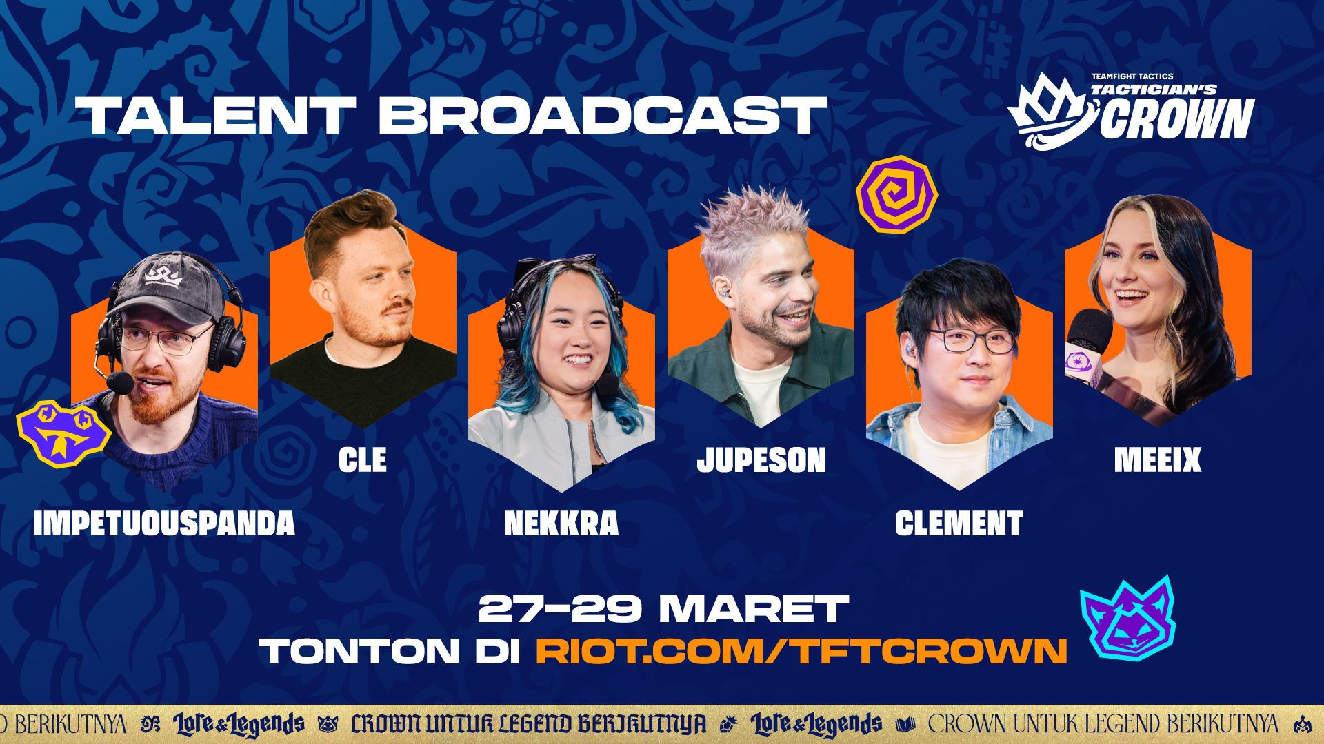 Setiap kisah epik butuh narator. Inilah tim on-air Tactician’s Crown Lore & Legends. Mereka siap menyiarkan semua aksi, sorotan utama, dan permainan legendaris saat 40 Tactician terbaik menciptakan sejarah di Runeterra!