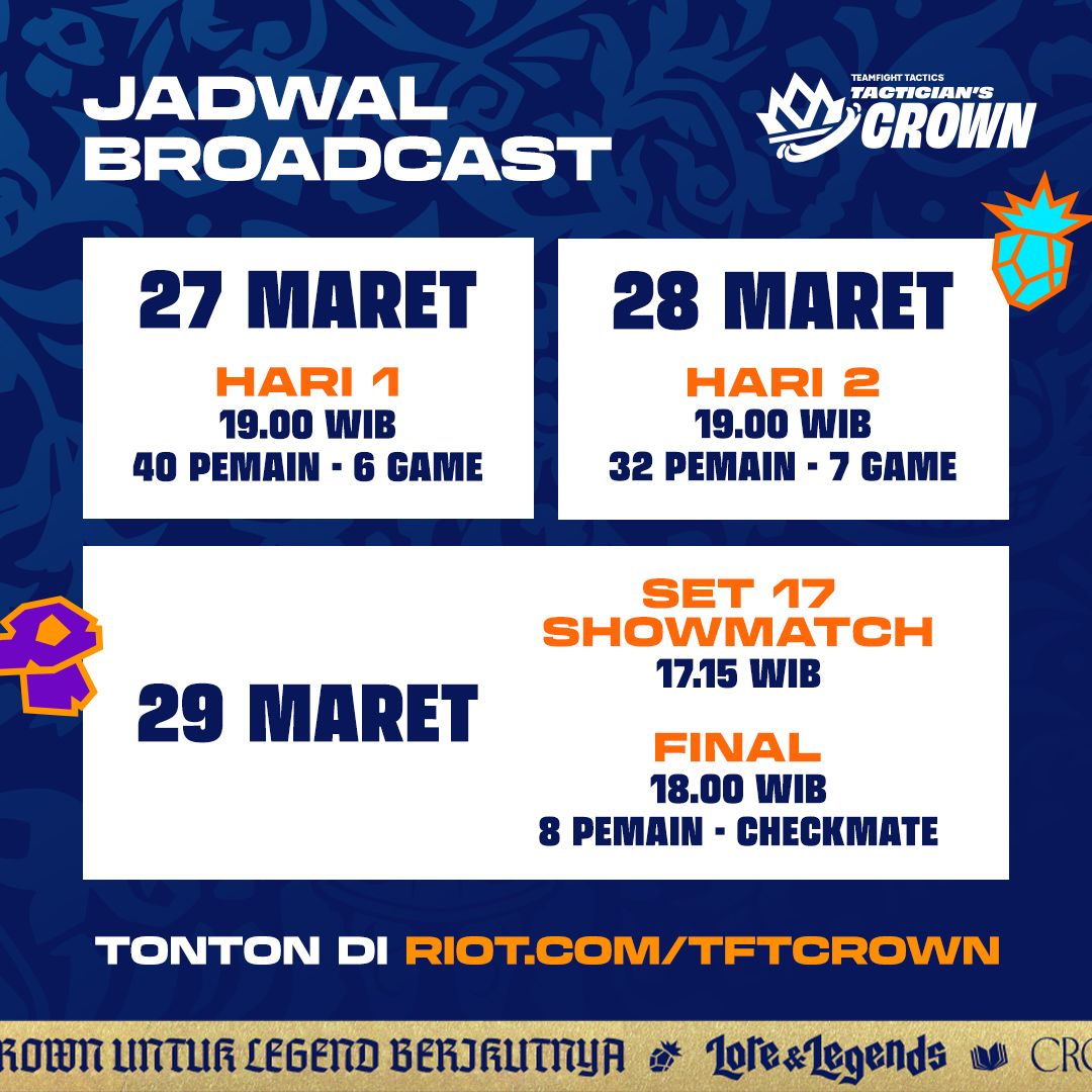 Masuki kisah Lore & Legends di Tactician’s Crown yang berlangsung pada 27–29 Maret. Sebanyak 40 pemain terbaik dunia bertanding untuk memperebutkan tempat mereka dalam sejarah Runeterra. Selama satu akhir pekan yang epik, mereka akan membuktikan siapa yang berhak mendapatkan gelar pemain TFT terbaik di dunia.