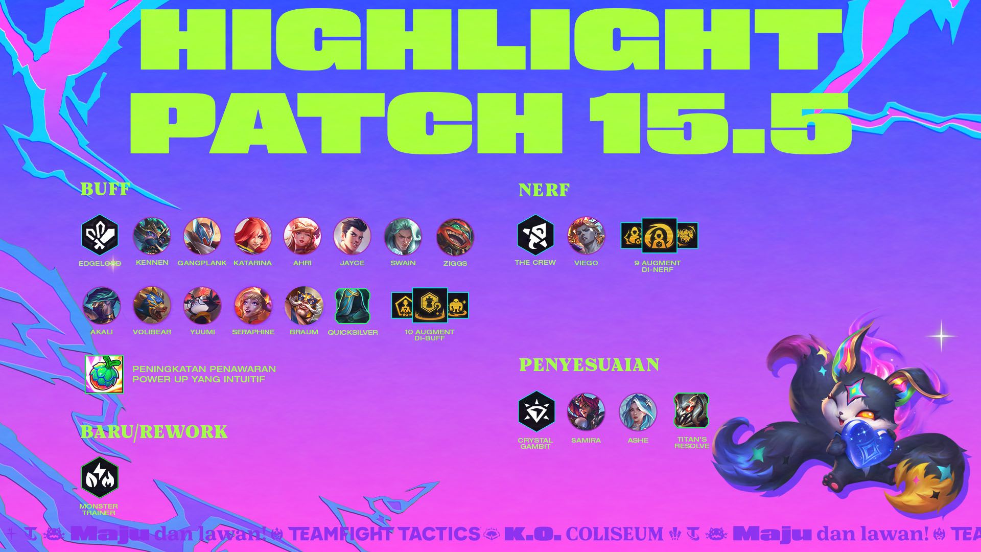 Perubahan keseimbangan ringan, tetapi peningkatan besar untuk Power Up. Patch 15.5 sudah masuk ring.