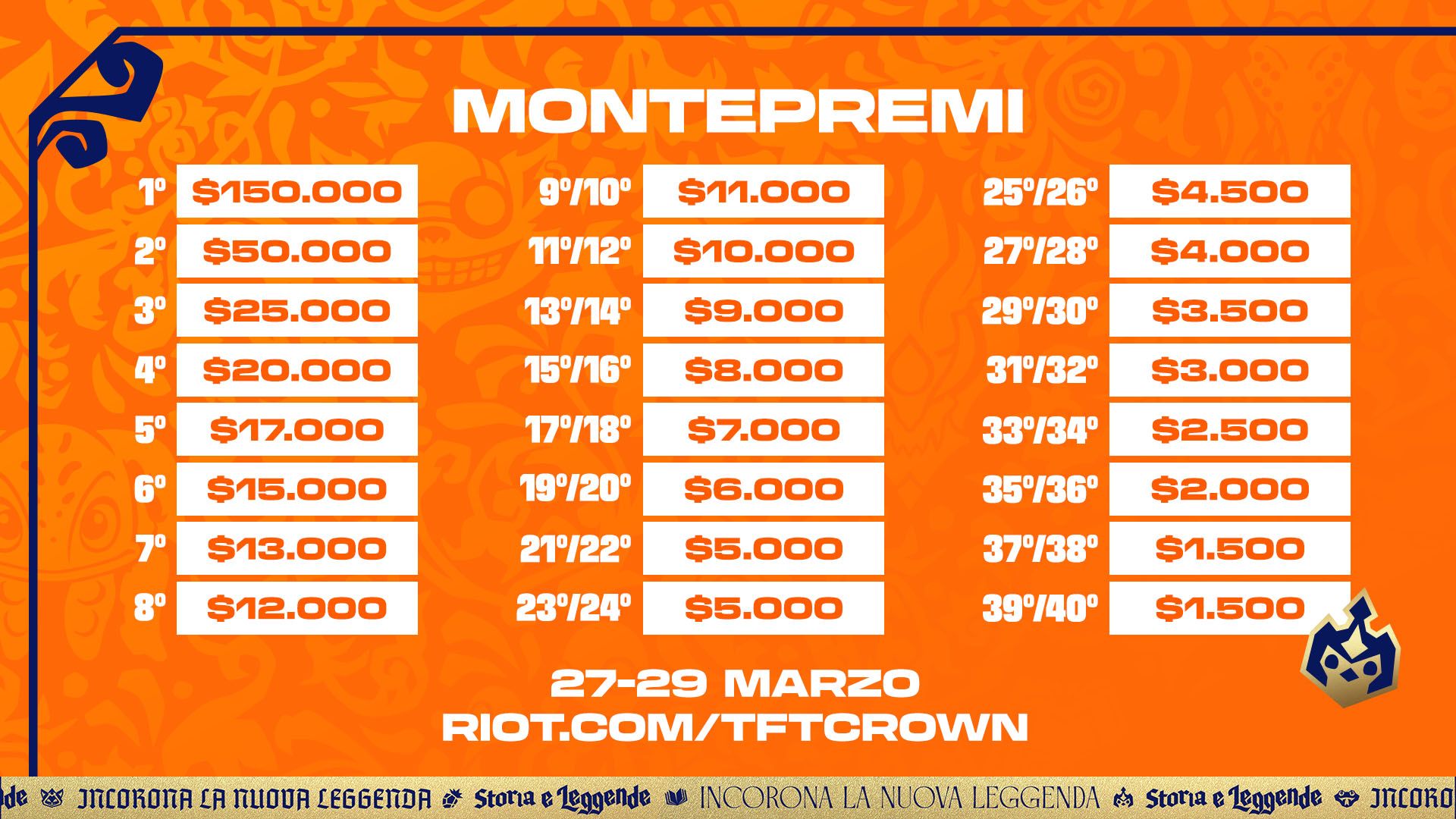 I giocatori si sfideranno per aggiudicarsi una parte del montepremi di 470.000 dollari. La leggenda che raggiungerà il primo posto si porterà a casa 150.000 dollari, il trofeo del Tactician's Crown e il prestigioso titolo di Campione del mondo di Storia e leggende.Vedi i dettagli della suddivisione del montepremi: