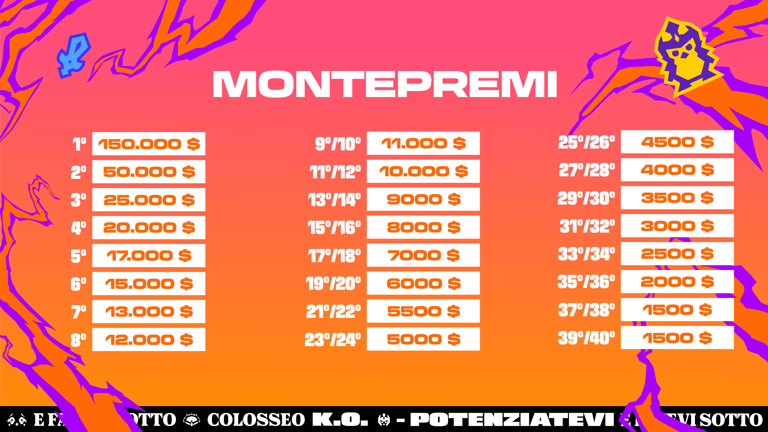 I giocatori si sfideranno per aggiudicarsi una parte del montepremi di 470.000 dollari. Consultate la tabella seguente: