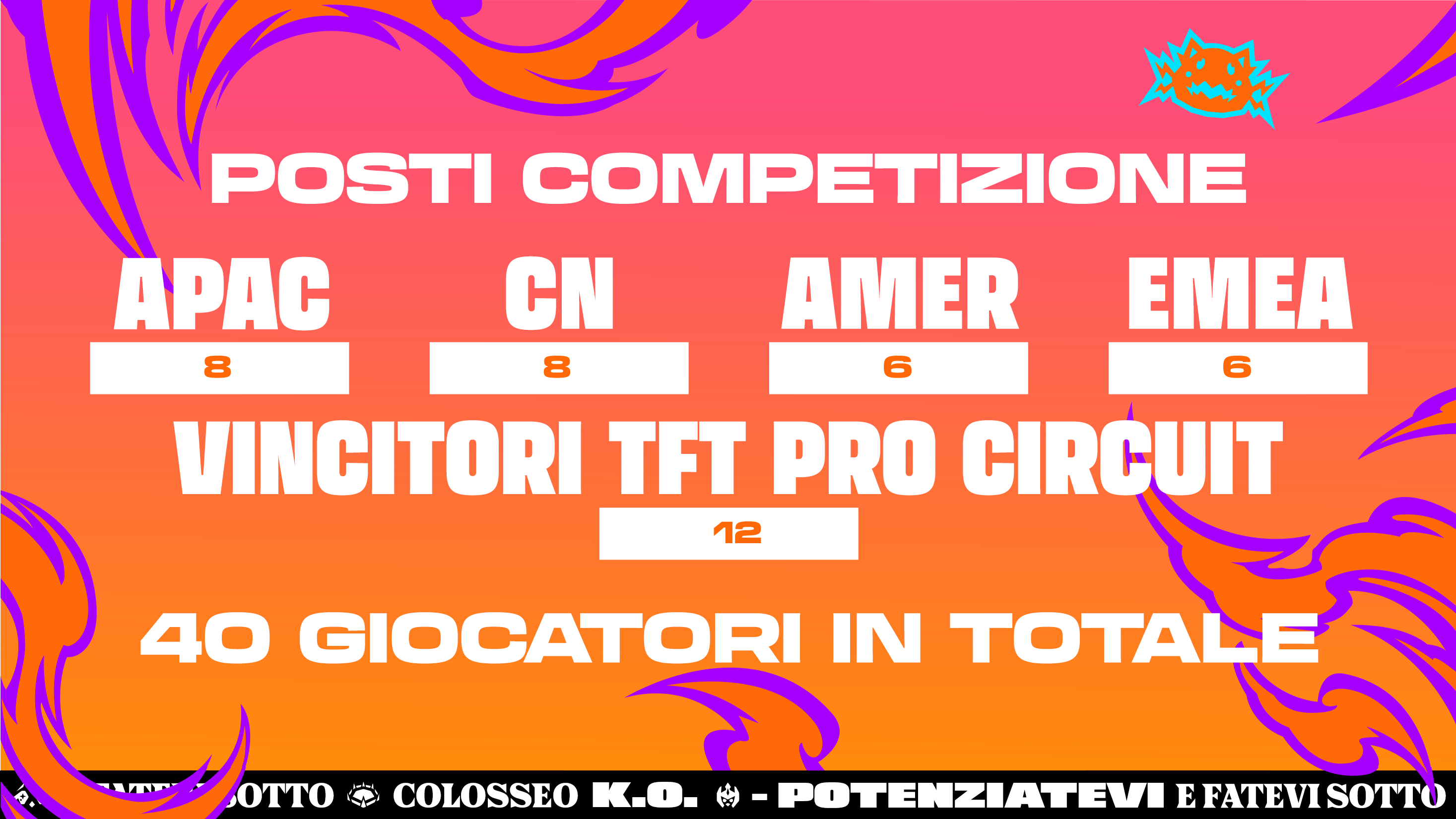 Il Tactician's Crown di Colosseo K.O. si svolgerà dal 14 al 16 novembre e richiamerà i migliori 40 giocatori da 4 regioni. Per la prima volta, i concorrenti qualificati si sfideranno offline: quelli di AMER ed EMEA si raduneranno ad Alicante, in Spagna, mentre quelli di APAC e CN si incontreranno in una sede offline nella regione CN!