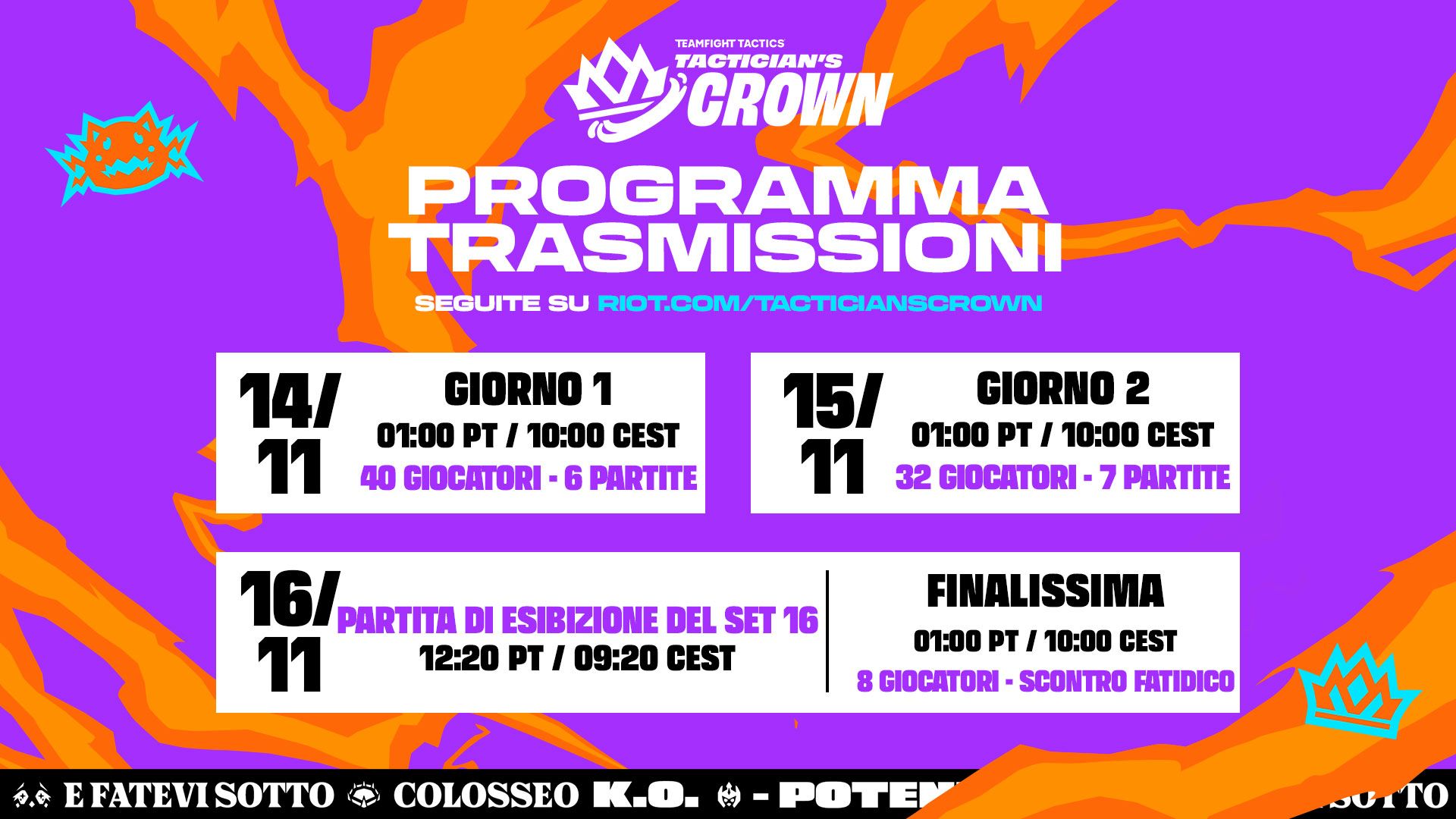Un solo stratega riuscirà a conquistare il montepremi di 150.000 $, la Corona dello Stratega e il titolo di Campione di Colosseo K.O. Preparatevi a tre giorni di scontri entusiasmanti e alla grande rivelazione di ciò che ci aspetta in futuro su TFT.