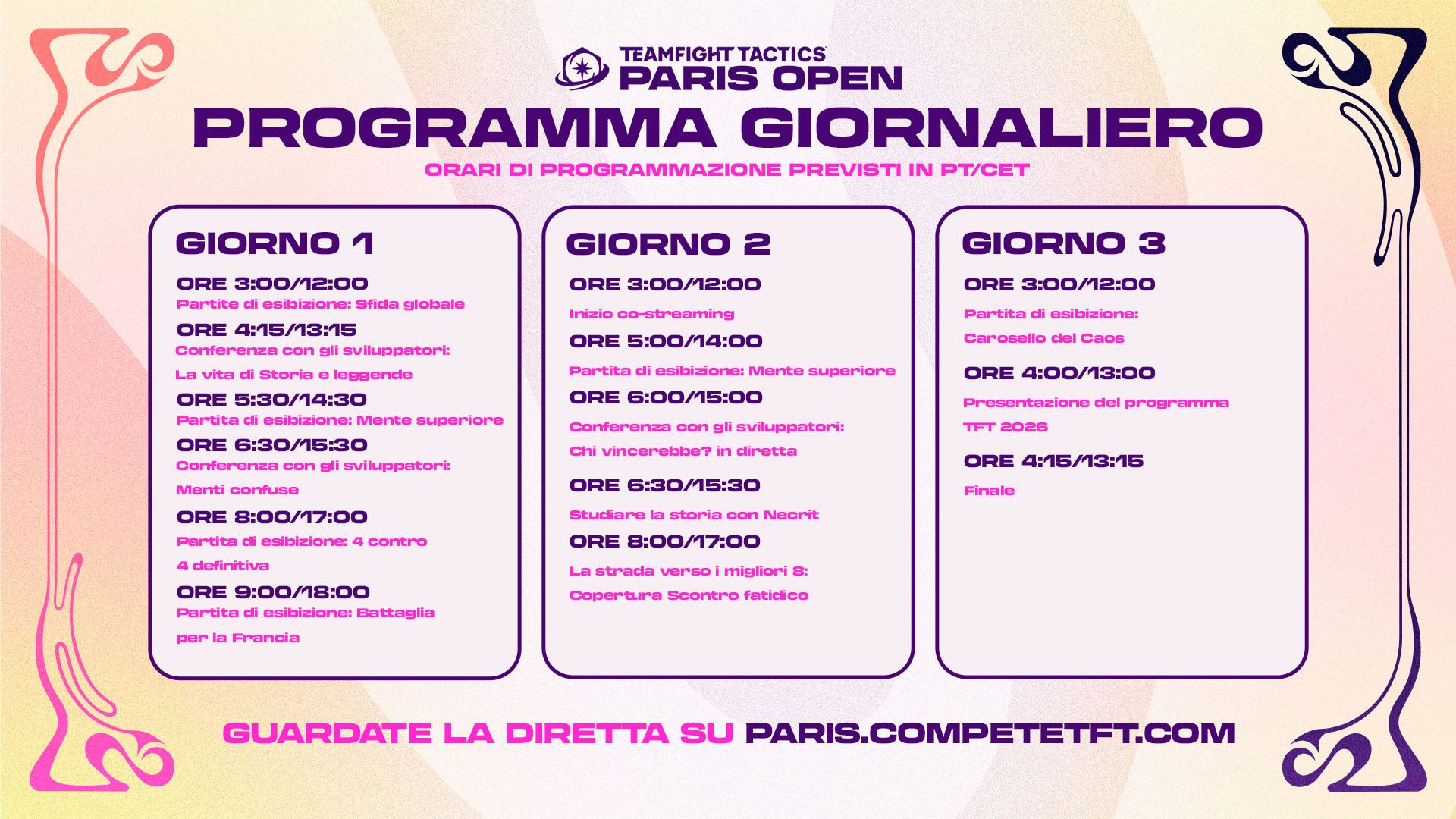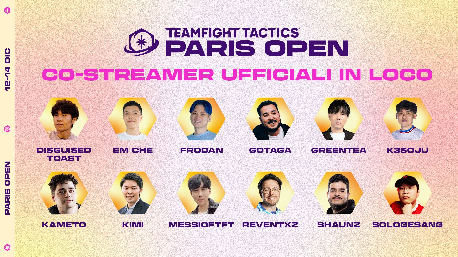 Ricordatevi di sintonizzarvi dal 12 al 14 dicembre per non perdervi il TFT Paris Open! Qui sotto potete trovare maggiori dettagli sul programma della trasmissione.