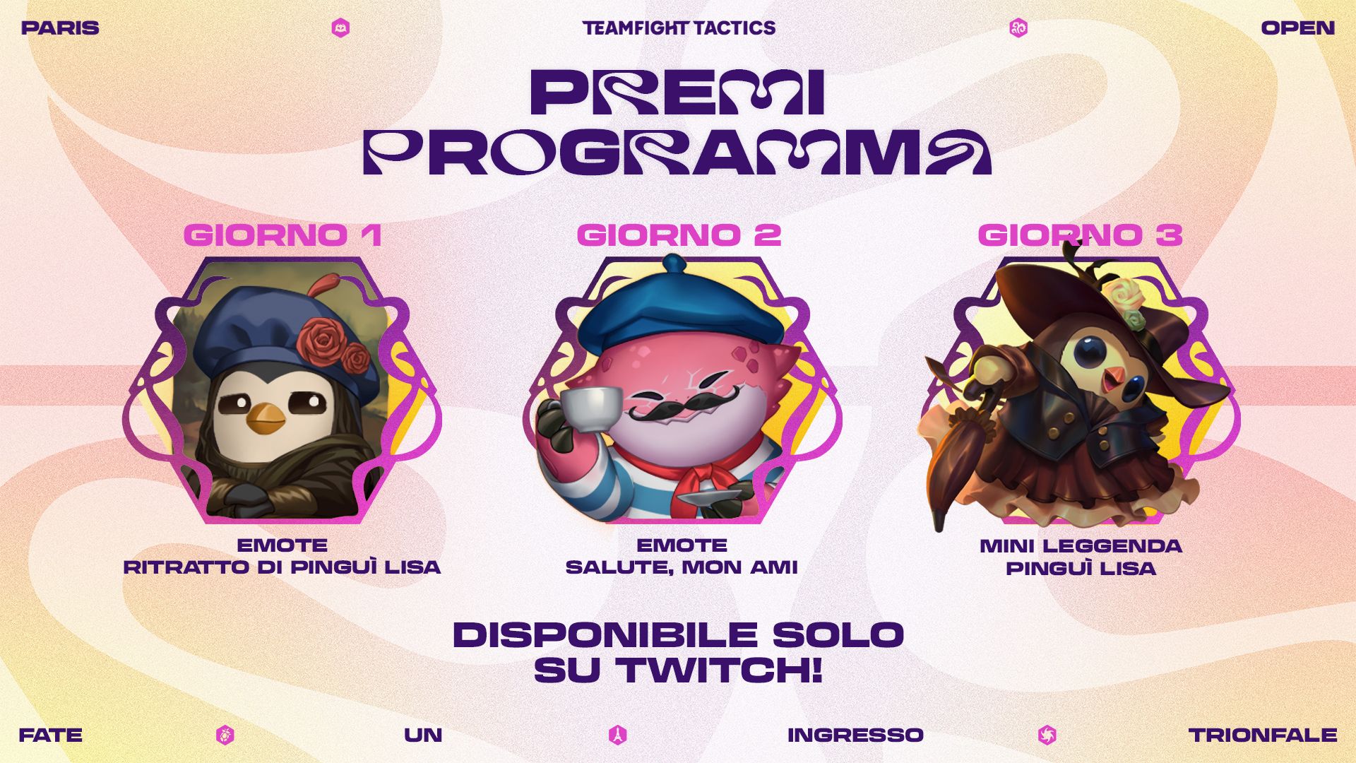 Anche questa volta, i Premi verranno distribuiti a tutti i fan che si sintonizzeranno sul TFT Paris Open! Offriremo Premi durante tutti e tre i giorni della competizione, quindi ricordatevi di seguirci su Twitch o YouTube per avere la possibilità di vincere... assicuratevi solo di collegare il vostro Riot ID al vostro account Twitch o YouTube.