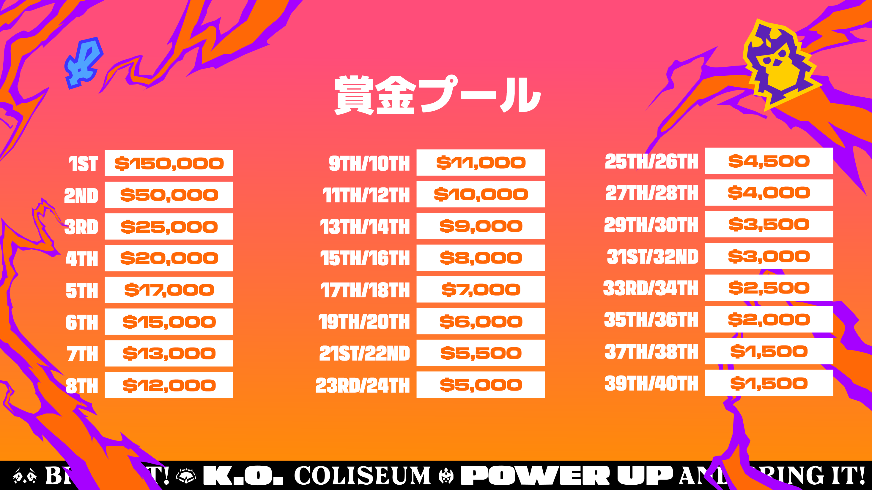 プレイヤーは賞金となる総額 470,000 USドルをかけて戦いに挑みます。以下で各順位の賞金の内訳をご覧ください。