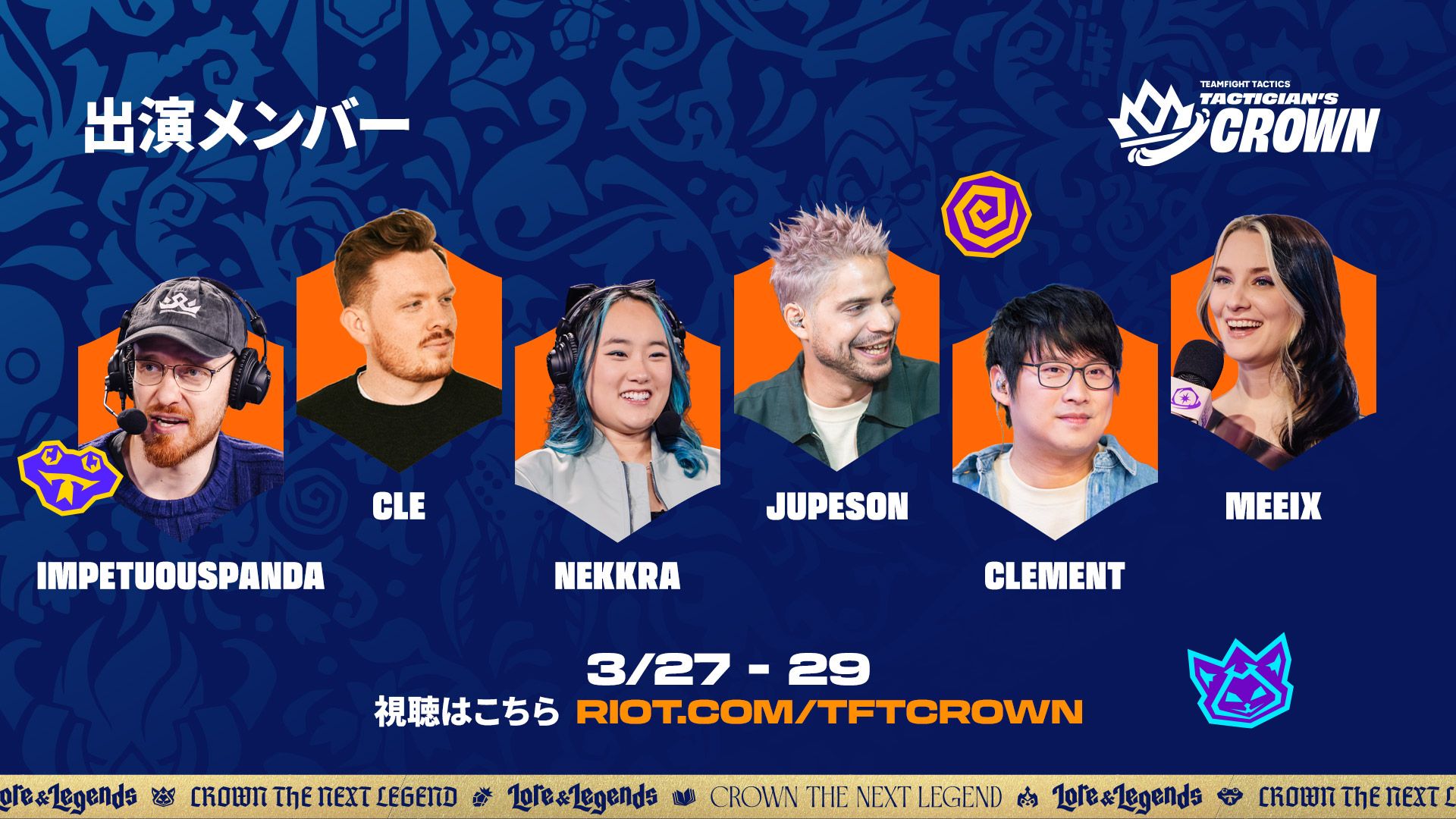 壮大な物語には語り手が必要です。ロア・アンド・レジェンズ Tactician’s Crown の放送出演者を紹介します。トップ 40 のタクティシャンたちがルーンテラに歴史を刻む瞬間を、アクション、主要ハイライト、伝説のプレイのすべてとともにお届けします。