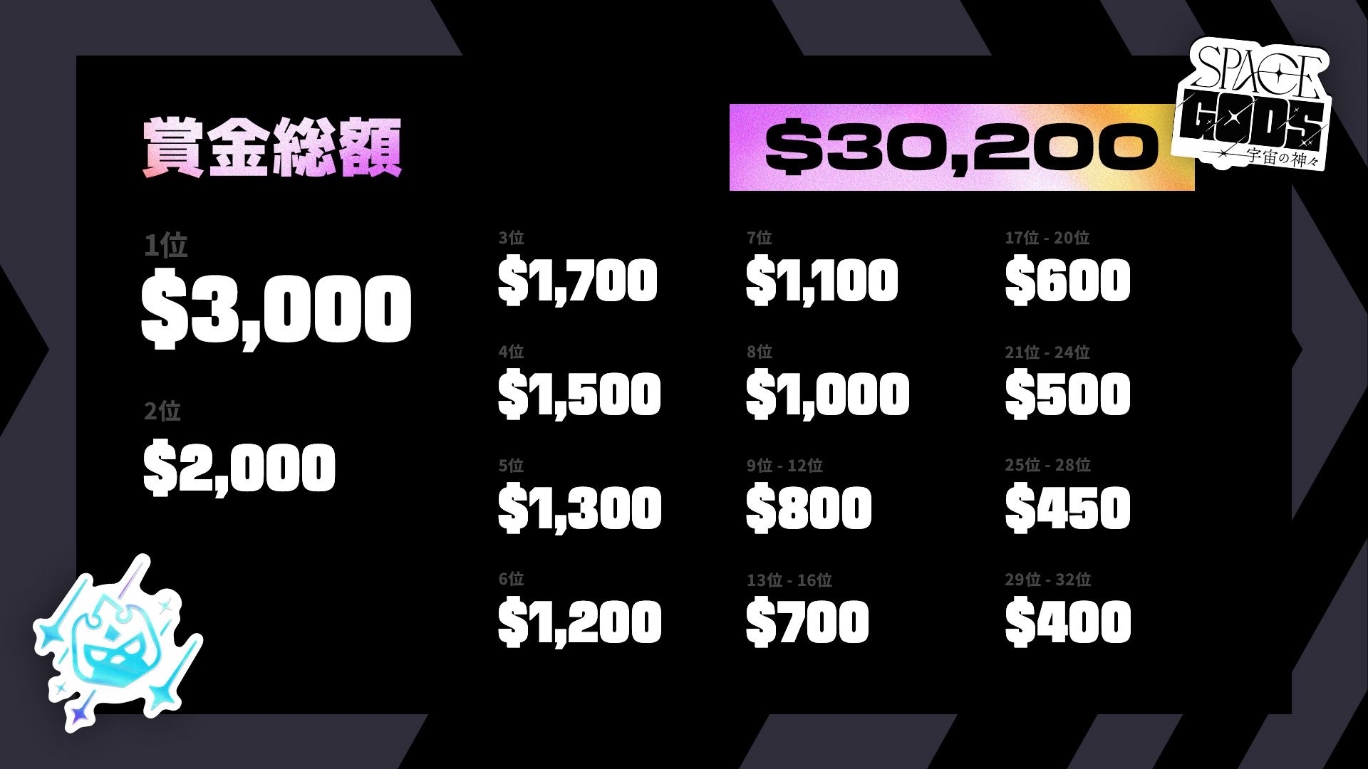 プレイヤーは賞金となる合計 30,000 USドルをかけて戦いに挑みます。以下で各順位の賞金の内訳をご覧ください。