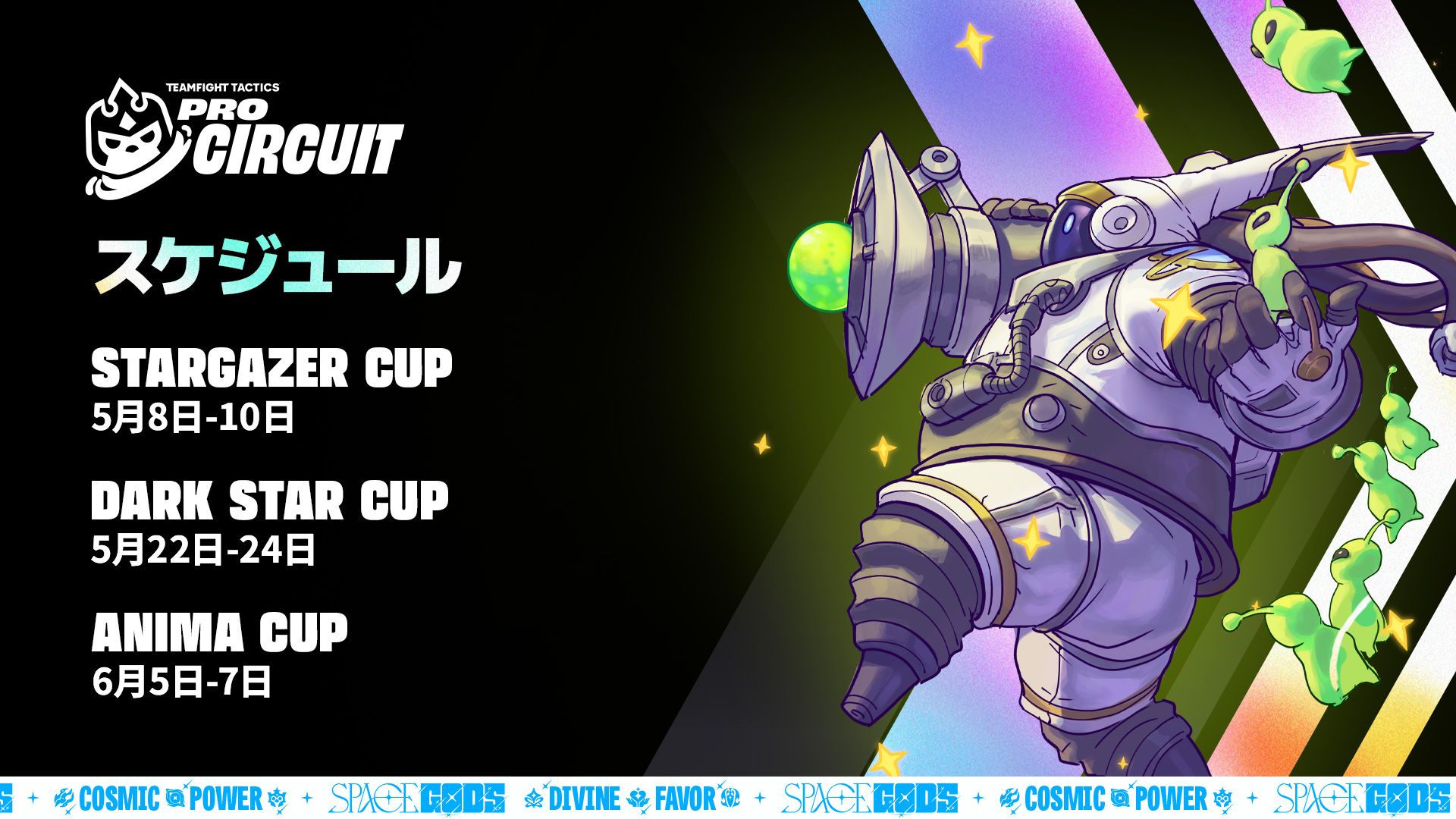 TFT Pro Circuitは、各地域のトップ32名がProポイント、総額30,000USドルの賞金、そしてRegional Finalsの出場権を懸けて戦うティア1の競技エコシステムです。「宇宙の神々」で開催される3回のTPCカップの日程は以下のとおりです。