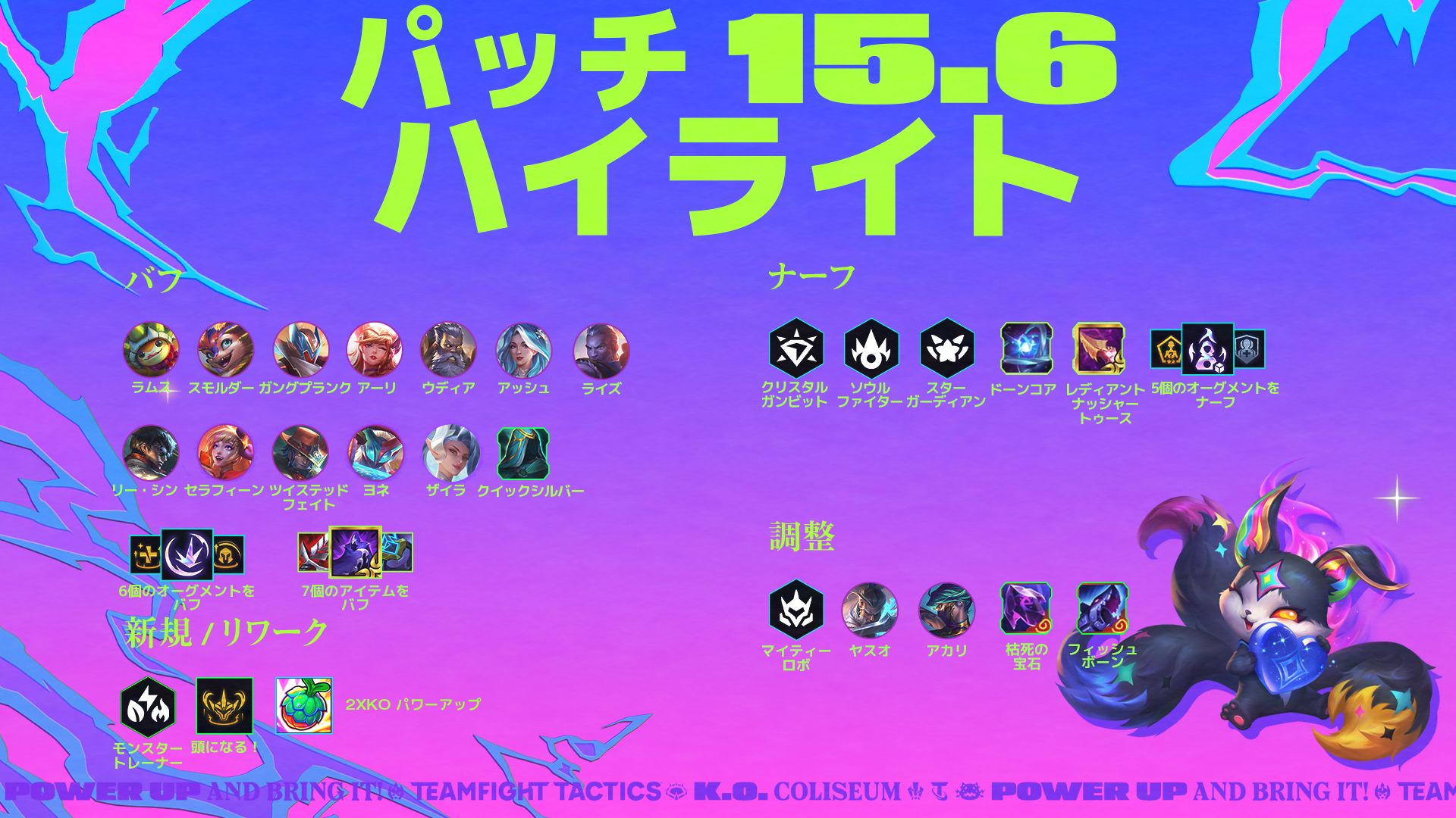 パッチ15.6では、コスト5ユニットの強化、特性の弱体化、そしてキャリー能力不足だった一部キャリーの強化が行われます──ここまでは全部バランス調整のお話。さらに本パッチでは2XKOのアーリーアクセス開始を記念して、2XKOをテーマにした新たなパワーアップがコンバージェンスに登場します!ダブルアップに本気を出すもよし、アオ・シンの超越で難所を突破するもよし。さっそくプレイしてみましょう!さらに、このパッチ期間終了までに12体のガイドで山頂に到達すれば、無料のポータルを獲得できます!