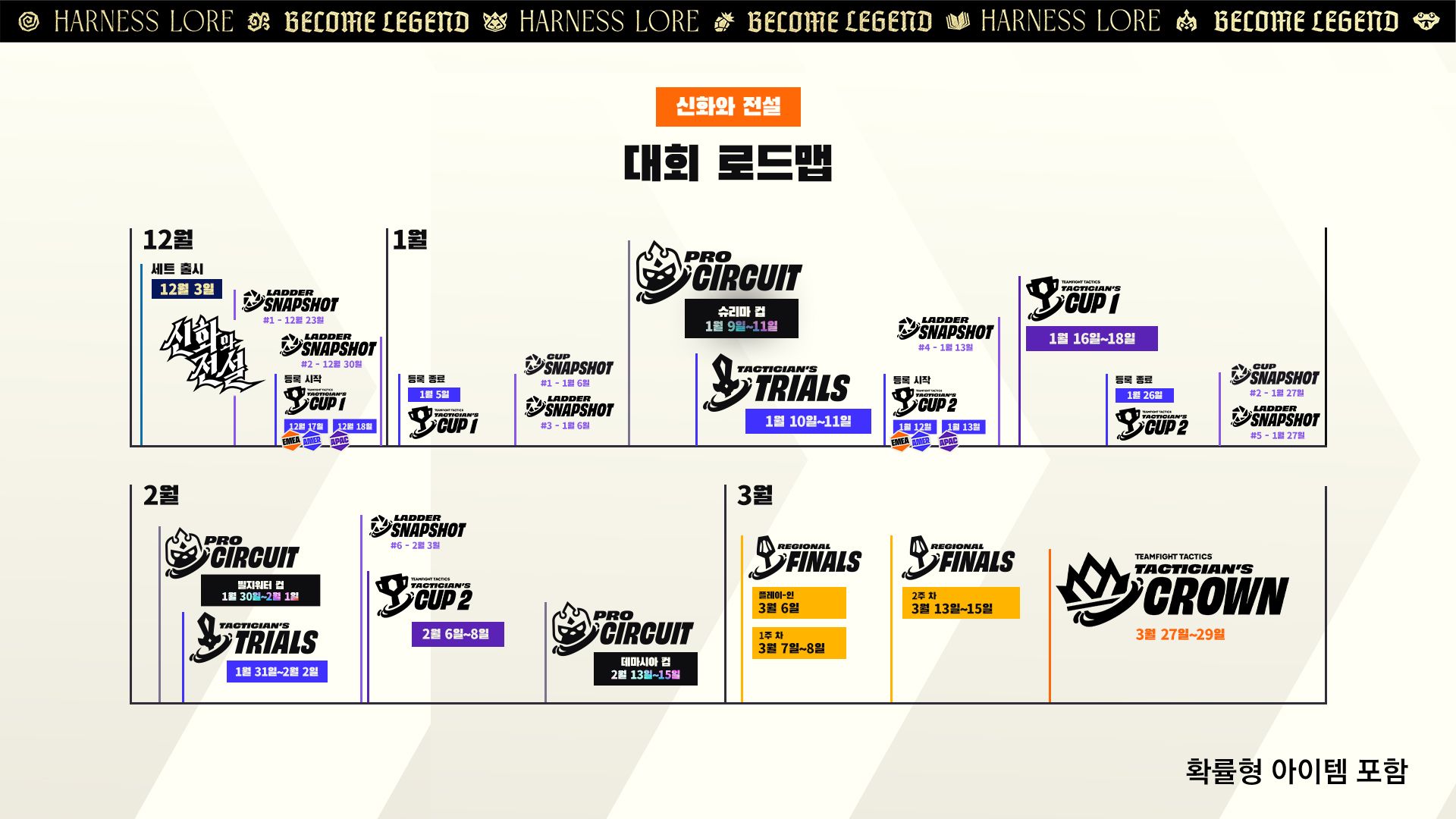 전략적 팀 전투 프로 서킷은 1티어 대회 생태계로서, 각 지역 상위 32명의 선수가 프로 포인트, 총상금, 지역별 결승 진출권을 얻기 위해 경쟁합니다. 신화와 전설에서 전략적 팀 전투 프로 서킷의 3개 컵 대회 일정은 다음과 같습니다.