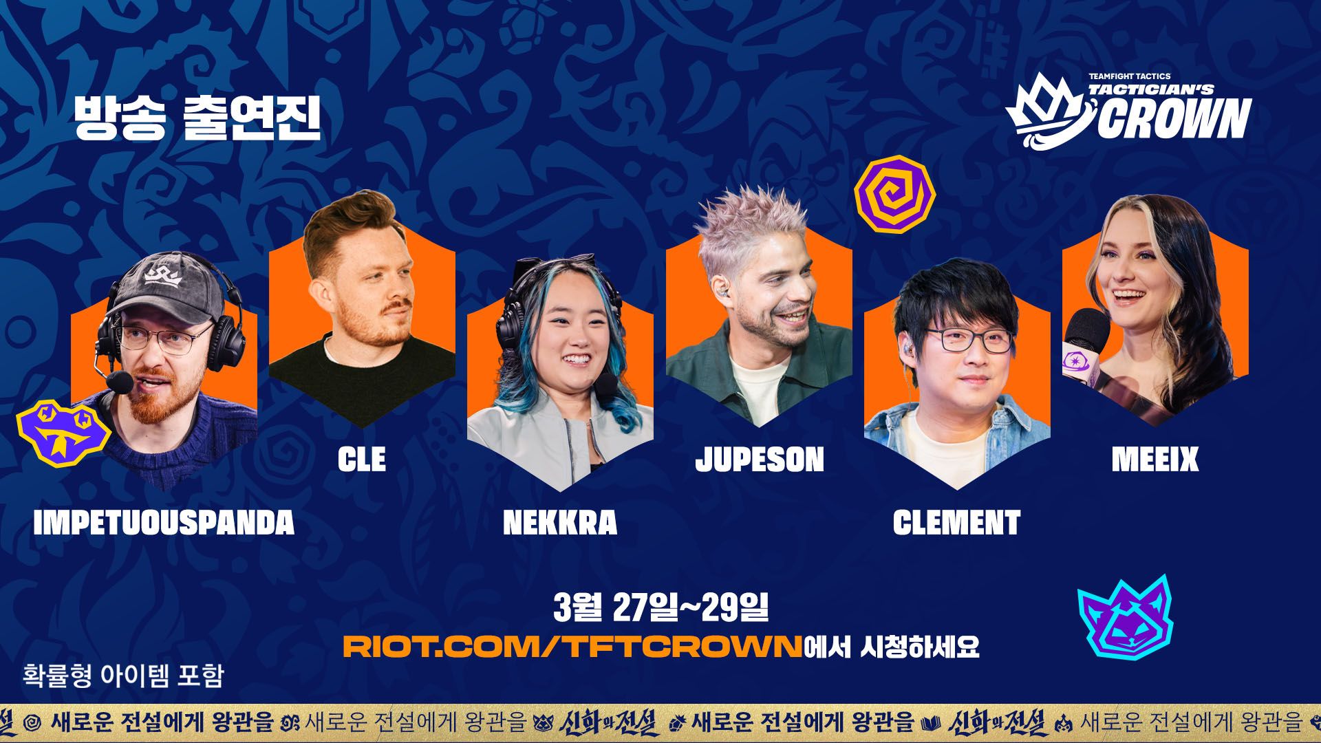 모든 영웅 서사는 해설자가 필요한 법이죠. 최고의 전략가 40명이 룬테라의 역사에 한 획을 그으면서 모든 액션, 중요 하이라이트, 전설적인 플레이를 가져다줄 신화와 전설 전략가의 왕관 생방송 출연진을 만나 보세요!