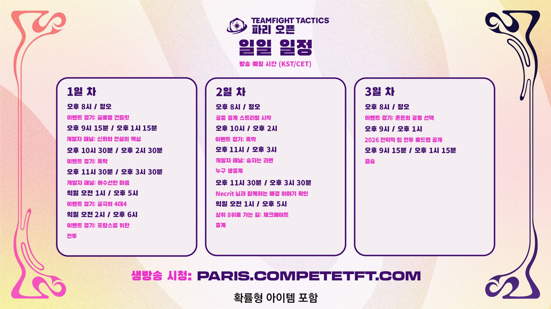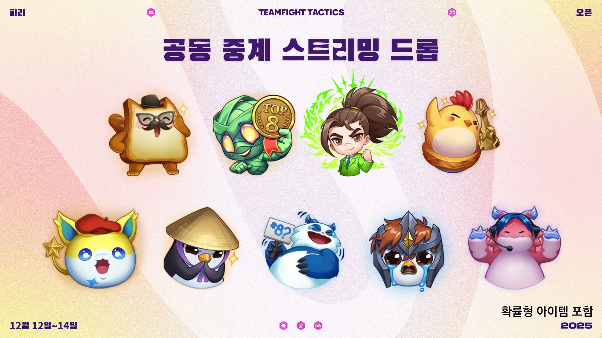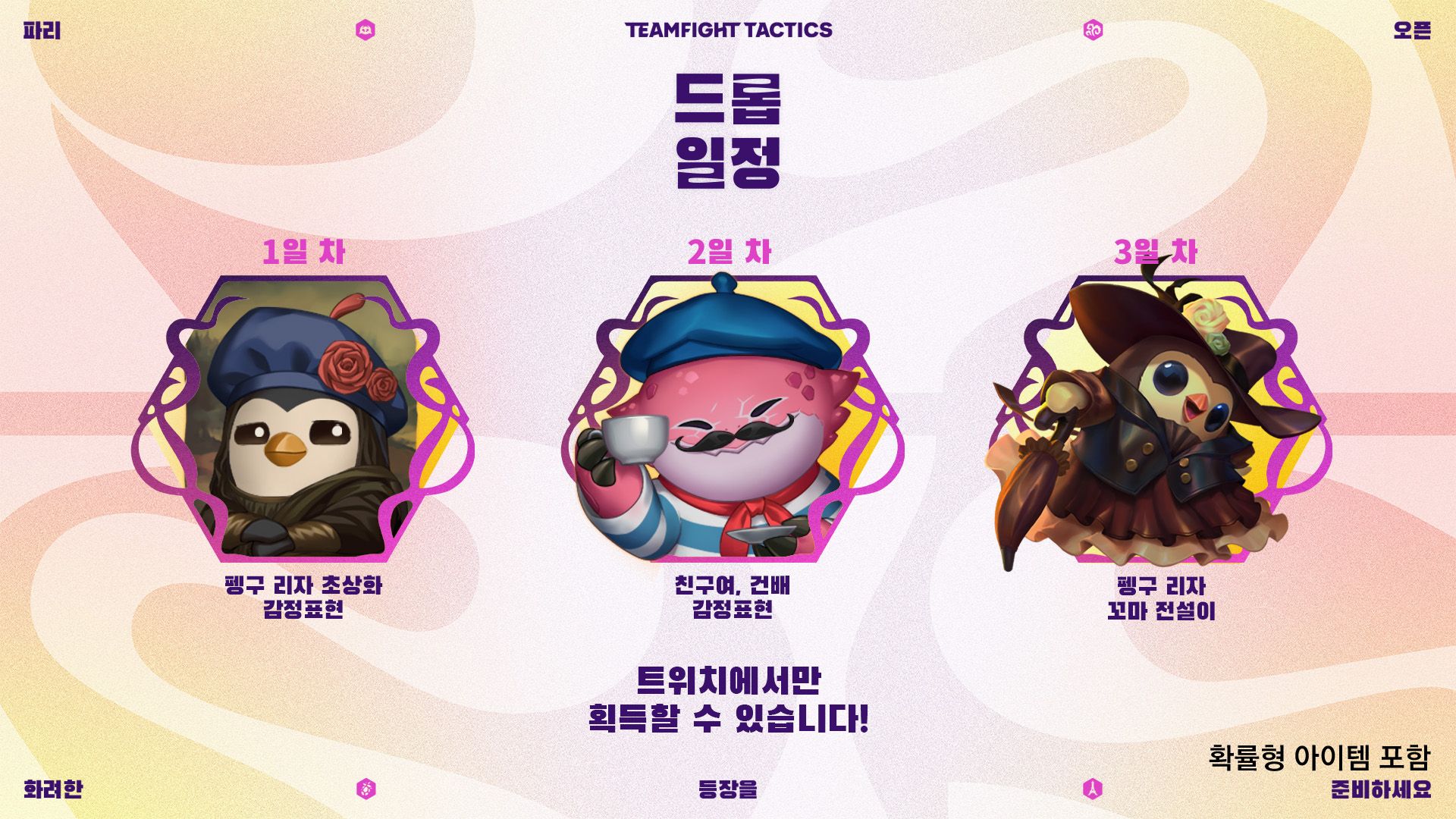 드롭이 전략적 팀 전투 파리 오픈을 시청하는 모든 팬 여러분을 위해 다시 한번 돌아옵니다! 대회가 진행되는 3일 동안 드롭이 제공될 예정이니, 꼭 트위치 또는 유튜브를 통해 시청해 주세요. Riot ID를 트위치 또는 유튜브 계정과 연결하는 것도 잊지 마시고요.
