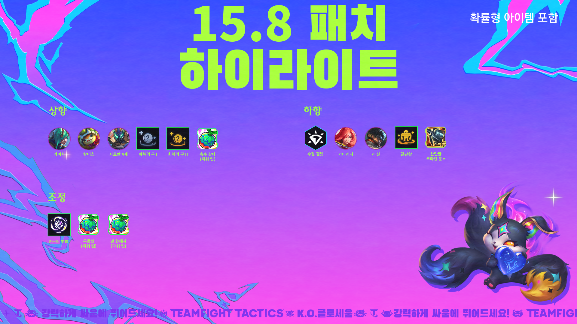 마지막으로, 일반적으로 밸런스에 맞게 강력한 조합을 최상위권 조합으로 만들던 끝판왕을 하향했으며, 요새 조합의 경쟁력을 유지하고자 조합을 지나치게 강력하게 만들던 증강의 위력을 낮추었습니다.