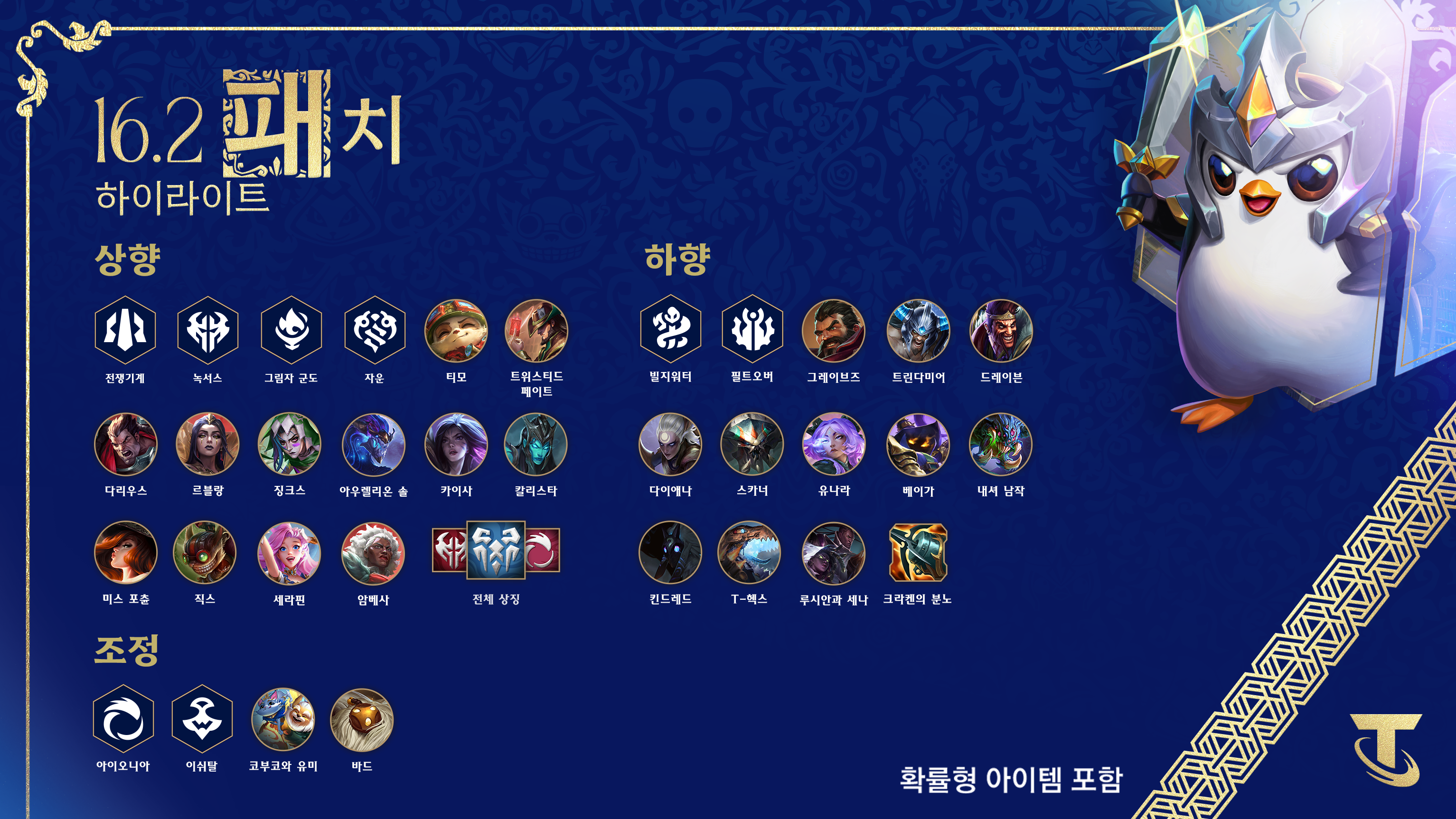 작년의 추가 패치 이후 첫 번째 패치인 16.2 패치에서는 공격력 조합과 주문력 조합 간의 격차를 줄이고, 상징을 장착한 유닛들의 위력을 유지하면서도 상징을 효율적으로 만들며, 당연하지만 달콤한 밸런스를 맞추는 데 집중했습니다.