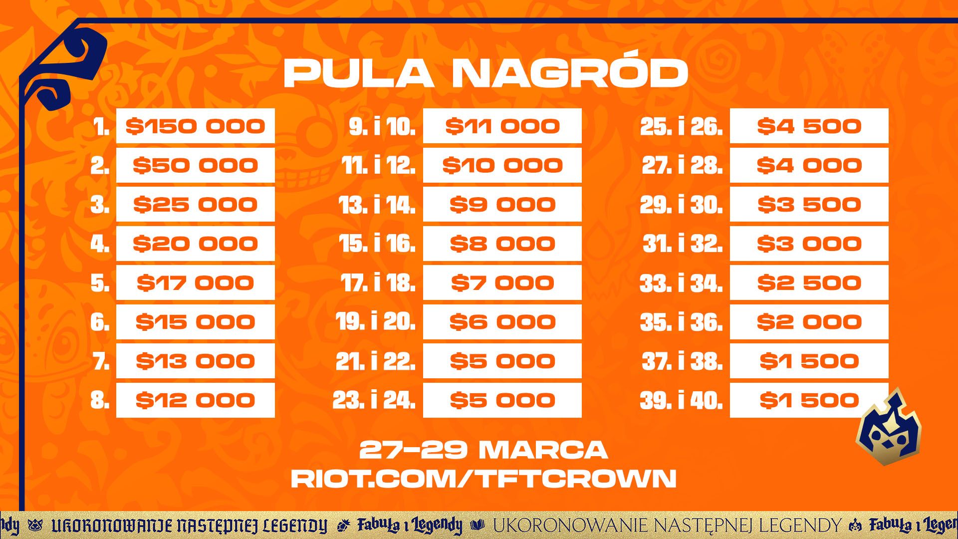Uczestnicy będą walczyć o pulę nagród wartą w sumie 470 000 USD. Legenda, która zajmie 1. miejsce, otrzyma 150 000 USD, trofeum Tactician’s Crown oraz prestiżowy tytuł Mistrza świata Fabuły i Legend.Oto szczegółowy podział puli nagród: